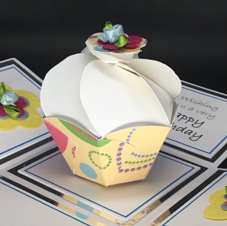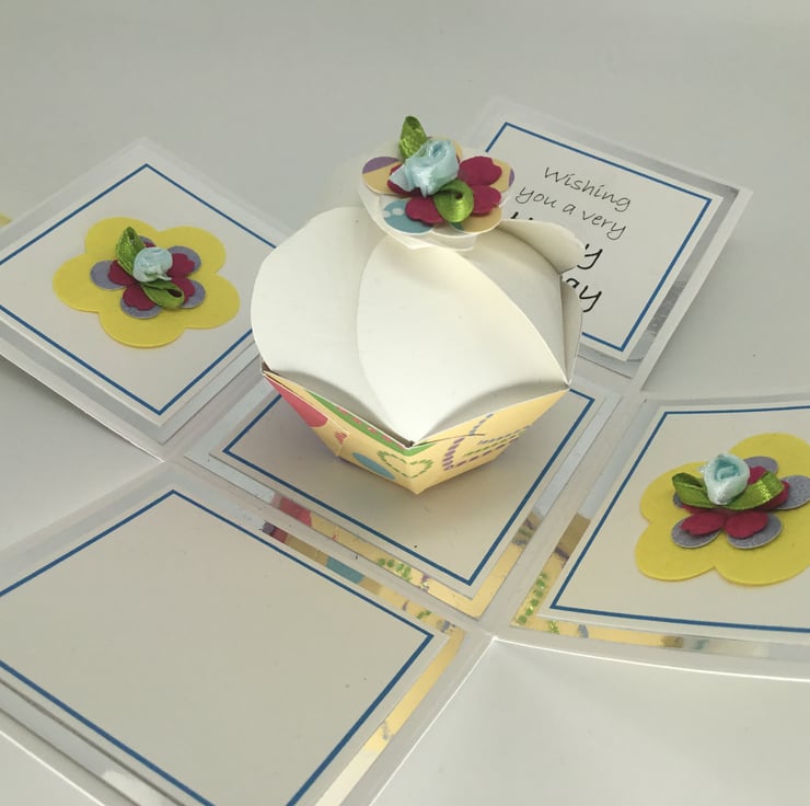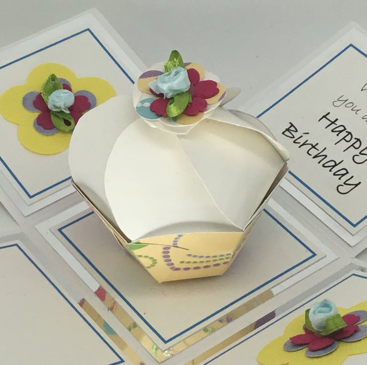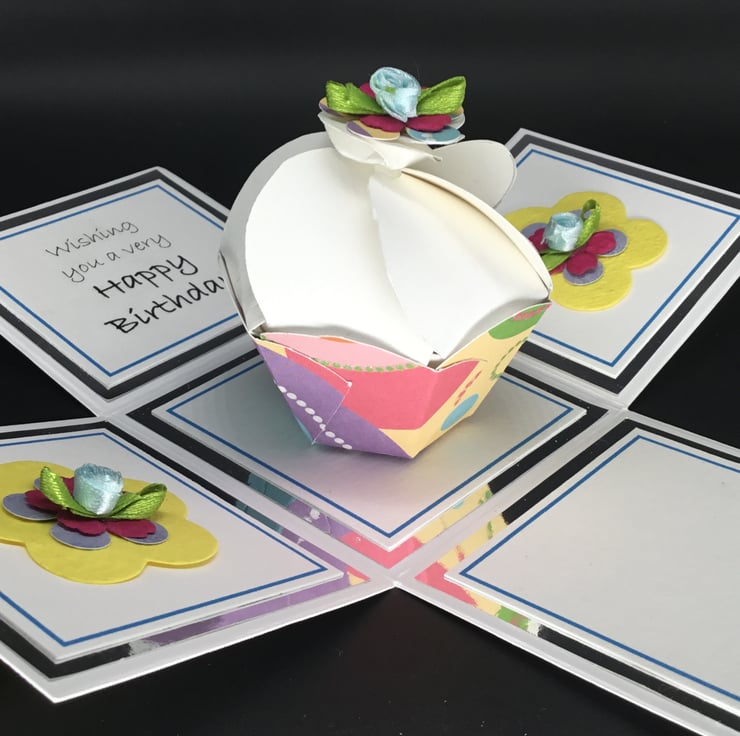 The cupcake has been made using quality plain and glittered card stock and co-ordinating embellishments have been used to decorate two panels of the exploding box. The sentiment reads ‘Wishing you a very Happy Birthday’ and the fourth panel has been left blank for you to add your own personal message.