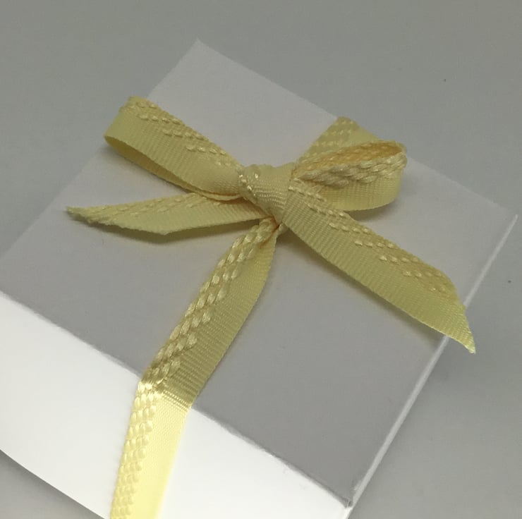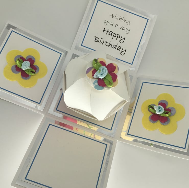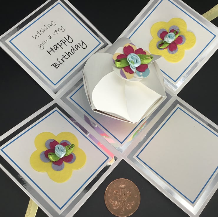 A co-ordinating ribbon is used to secure the exploding box when folded up, which measures approximately 7.5 cm x 7.5 cm and is approximately 7 cm tall.