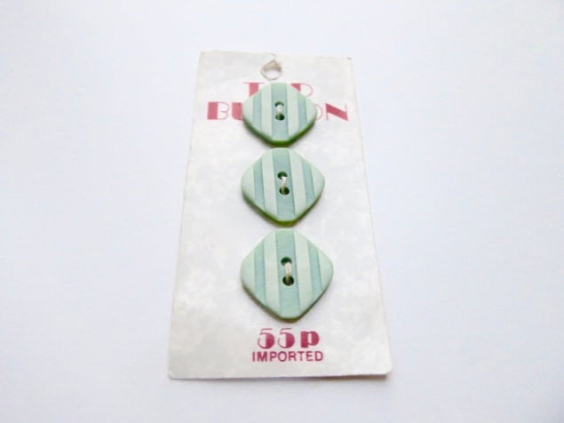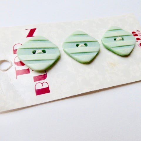 The two holed buttons are made of plastic with an ridged surface. The eau de nil colour is slightly flecked in places. The raised ridges appear to be lighter than the rest but that might just be an illusion.