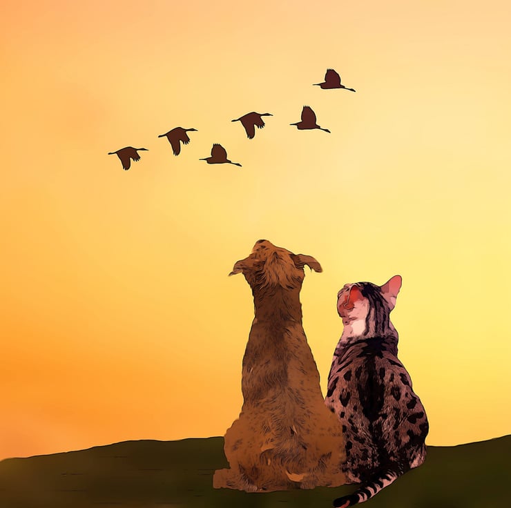 This card is of a dog and cat looking up towards the sky. There are a few bird's flying above. And that's it. No words needed, as you can write your own personal message inside.
