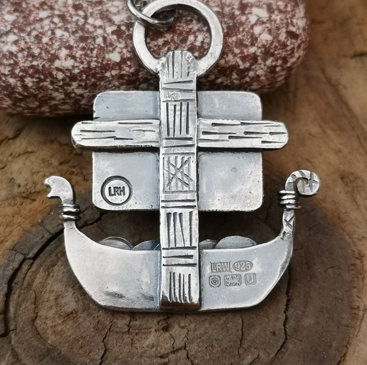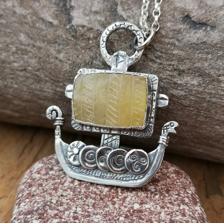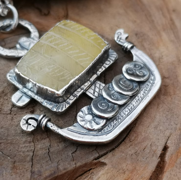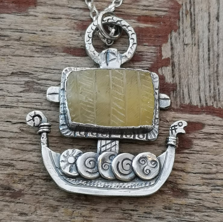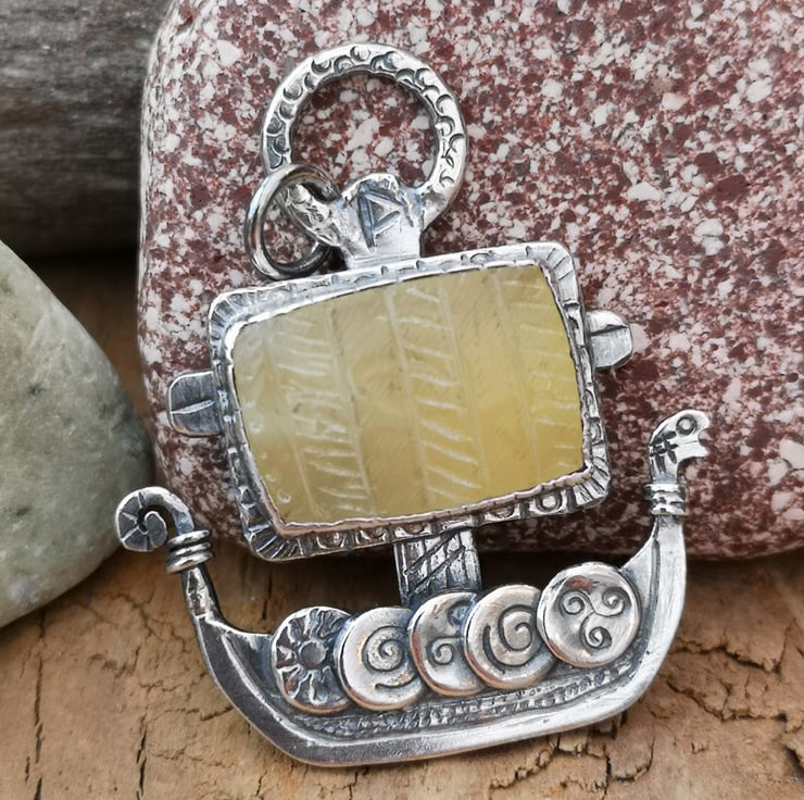 Made in sterling silver I have pierced out the shapes for this little viking ship, hand engraving and metal stamping to add detail before carefully soldering everything into place including five little viking shields. I have added natural amber for the sail on which I have carved a pattern giving the cabochon a naive and rustic feel. Above the sail I have stamped the rune symbol for 'Joy'.