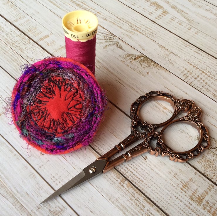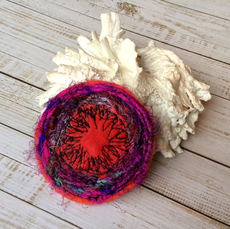 Individual handmade needle felt, silk wool and free motion embroidered circular brooch. It has a brooch pin with a safety catch on the reverse to keep it nice and secure. It measures 5.5cm approx.