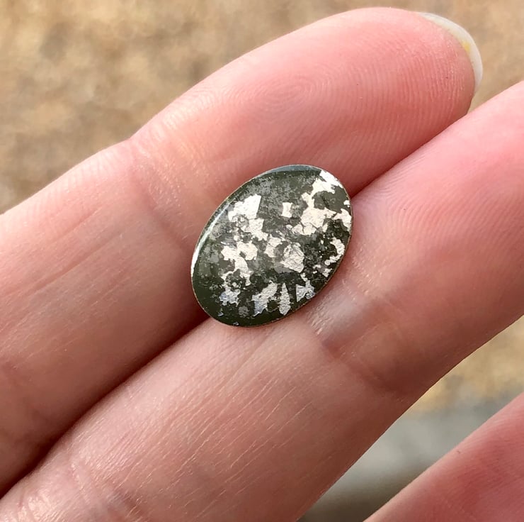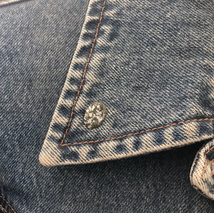 A silver tone oval tie tack 10x14mm has been hand enamelled using the cold enamel technique, silver leaf is then added before a final layer of clear enamel to produce this pretty pin.