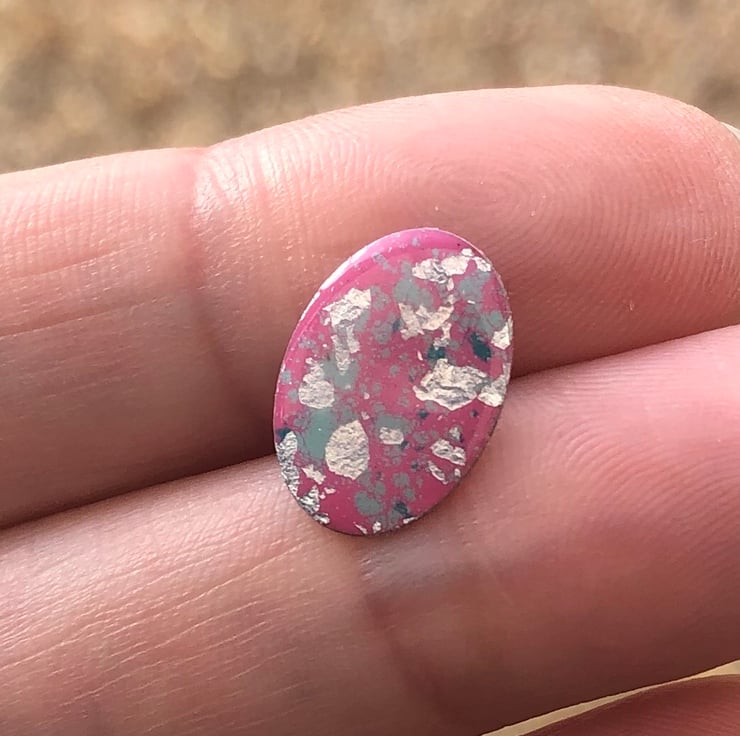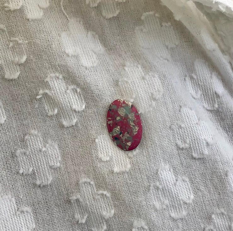 Hand enamelled lapel pin. Pink, turquoise & silver leaf.