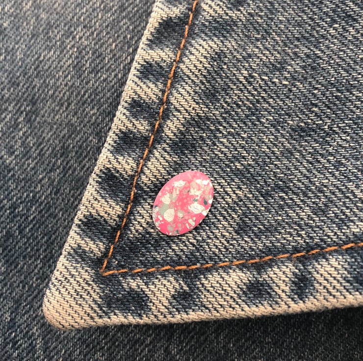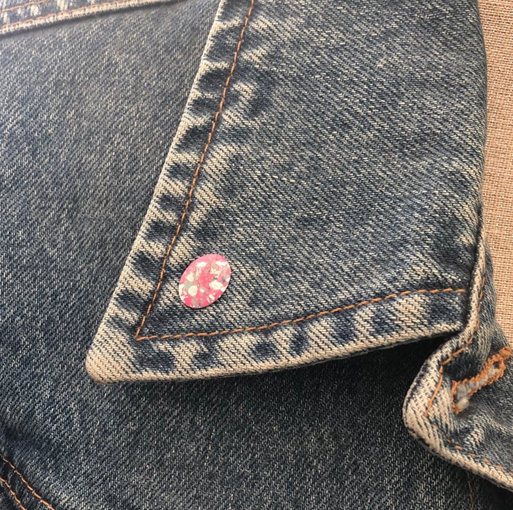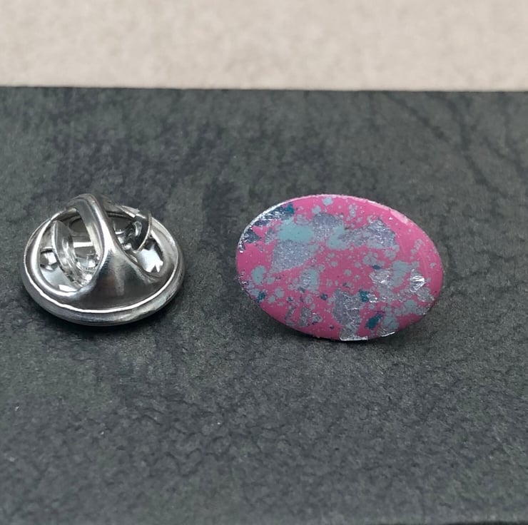 A silver tone oval tie tack 10x14mm has been hand enamelled using the cold enamel technique, silver leaf is then added before a final layer of clear enamel to produce this pretty pin.