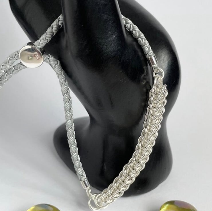 The beautifully woven slider section needed something that would match it and this particular chainmaille completes and compliments this unique design perfectly