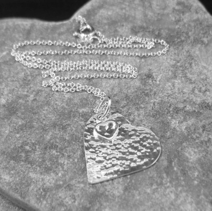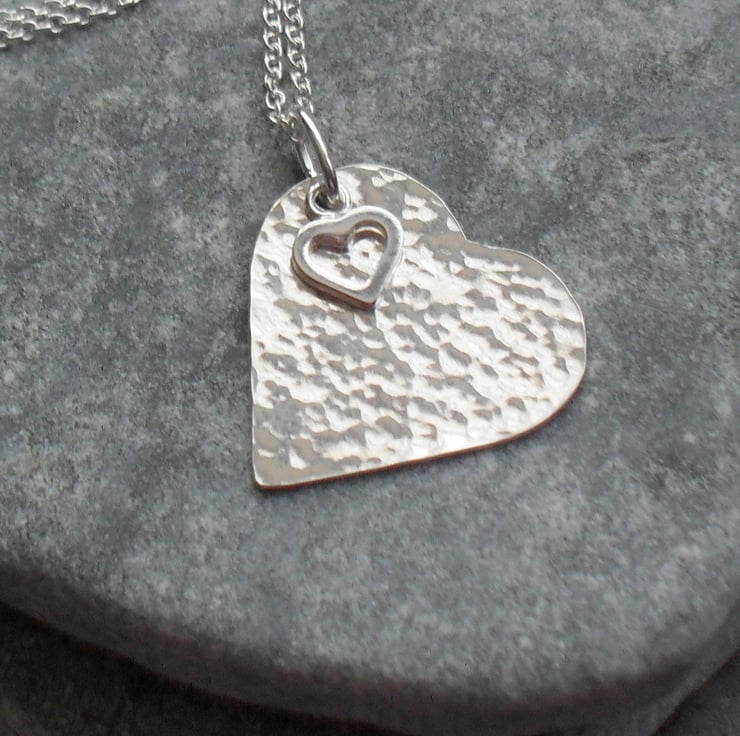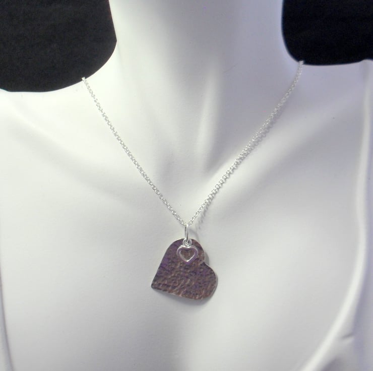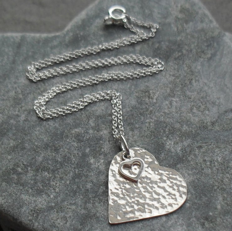 hammered to give texture on the front ,pendant has a small heart attached to the silver ring and is suspended from a sterling silver chain