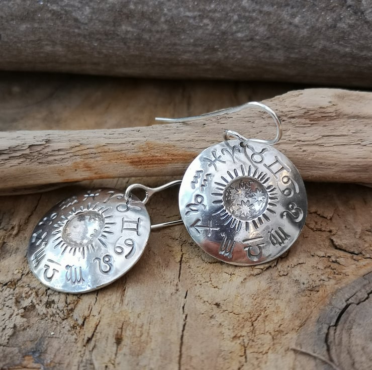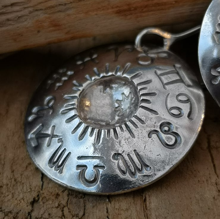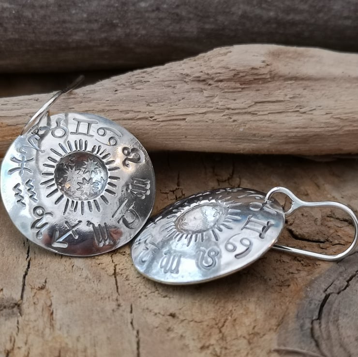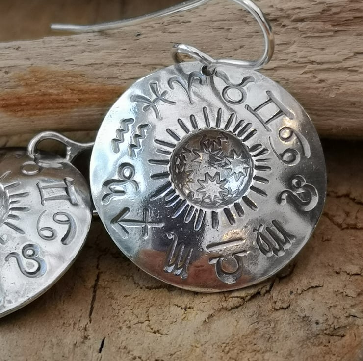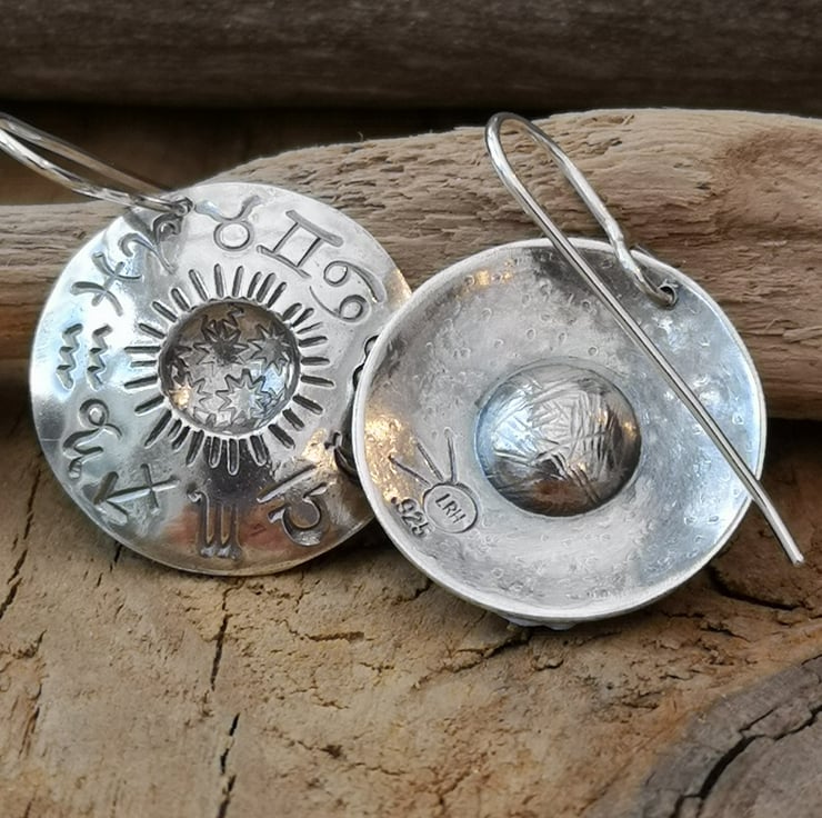 I have made these domed earrings using my zodiac metal stamps around the edge of sterling silver discs before piercing out the middle sections and then soldering smaller reversed domed discs to the centre. Oxidised finish with handmade hooks.