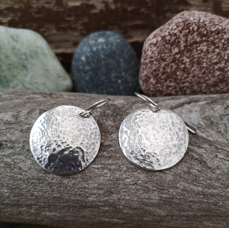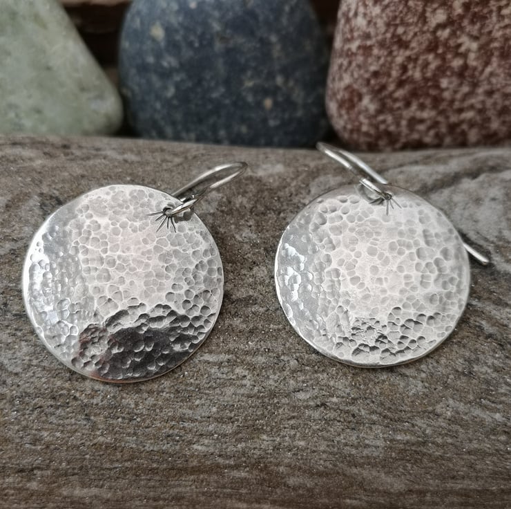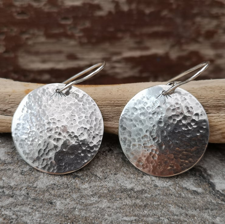 I have made these earrings cutting two discs out of sterling silver (each measuring 22mm across). The earrings are hammer textured and slightly domed with handmade hooks. Oxidised finish.