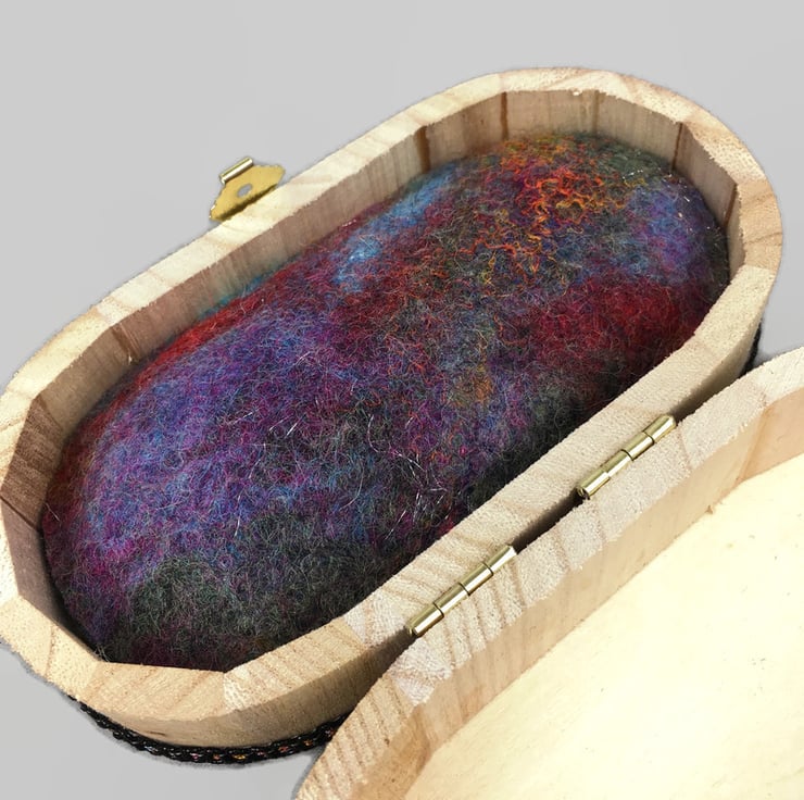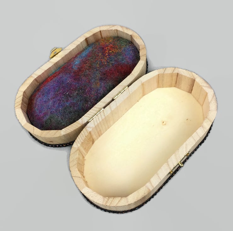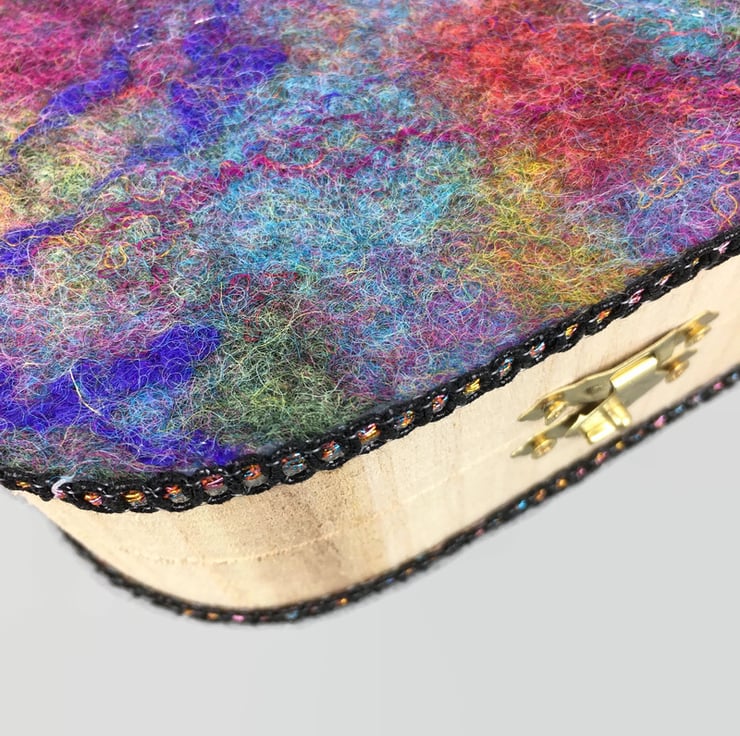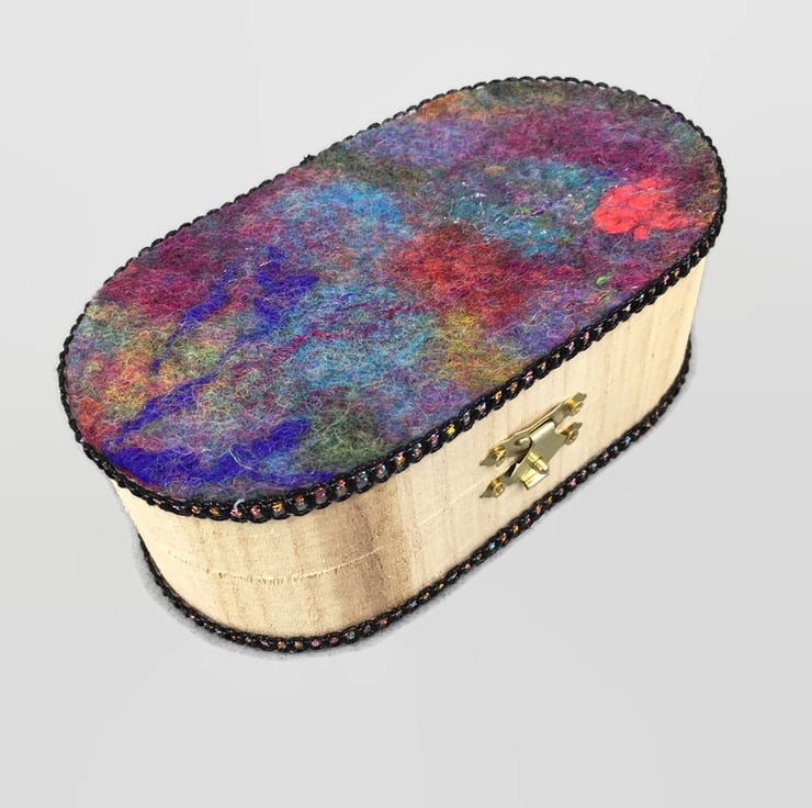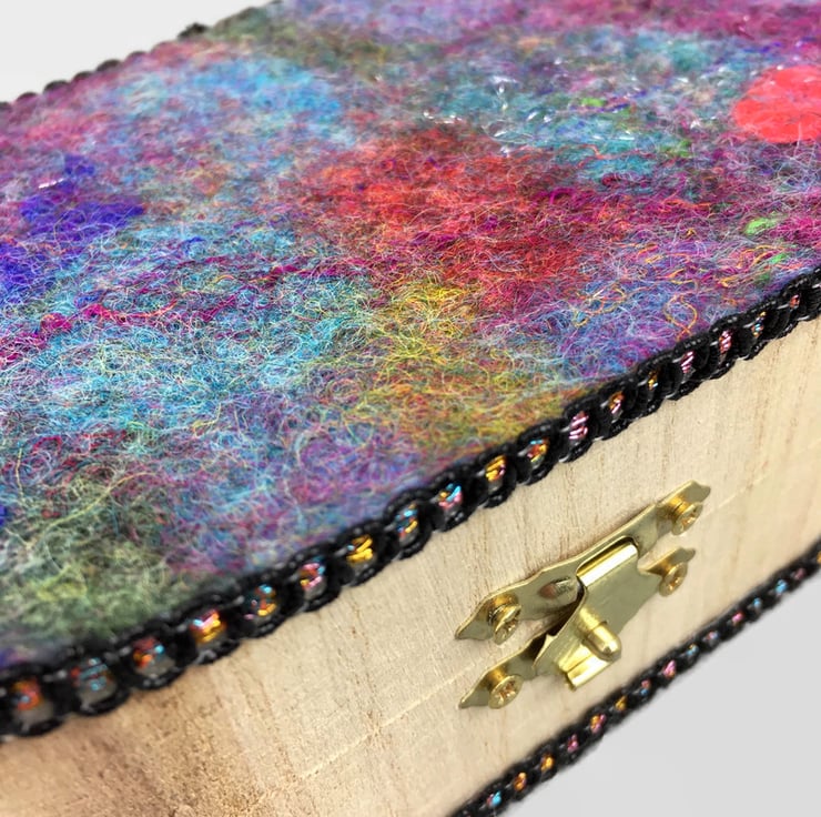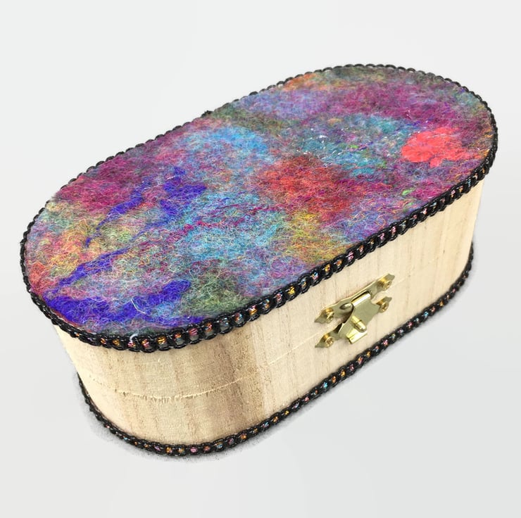 This lovely little wooden box has been decorated with a piece of hand made multicoloured felt and black sparkly trim.
