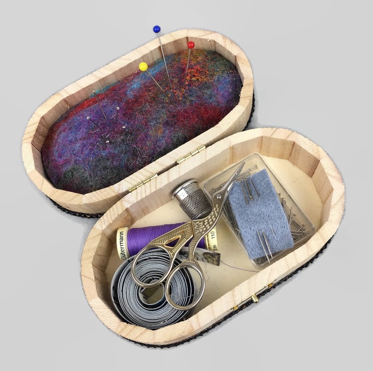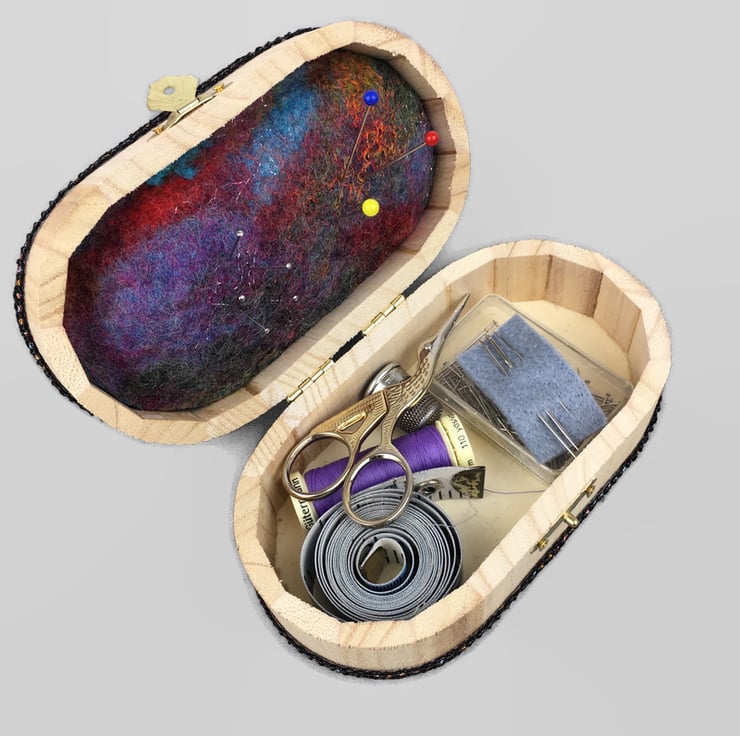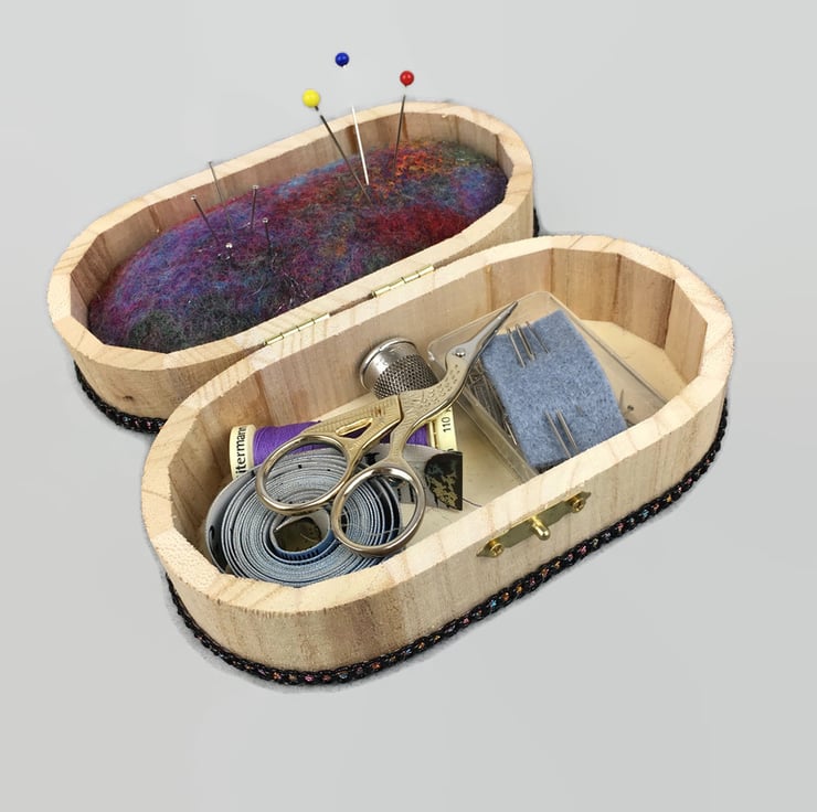 An integral felt covered foam based, padded pin cushion has been attached to the inside of the lid. This is a fabulous little box ideal for storing all your crafting accessories. Store all those little pieces needed for your project in one place needles, pins, buttons, beads, thread, ribbon and more. Great for sewing, beading, embroidery and other projects. It would also make a fabulous trinket box or keepsake box or a small jewellery box for travelling.