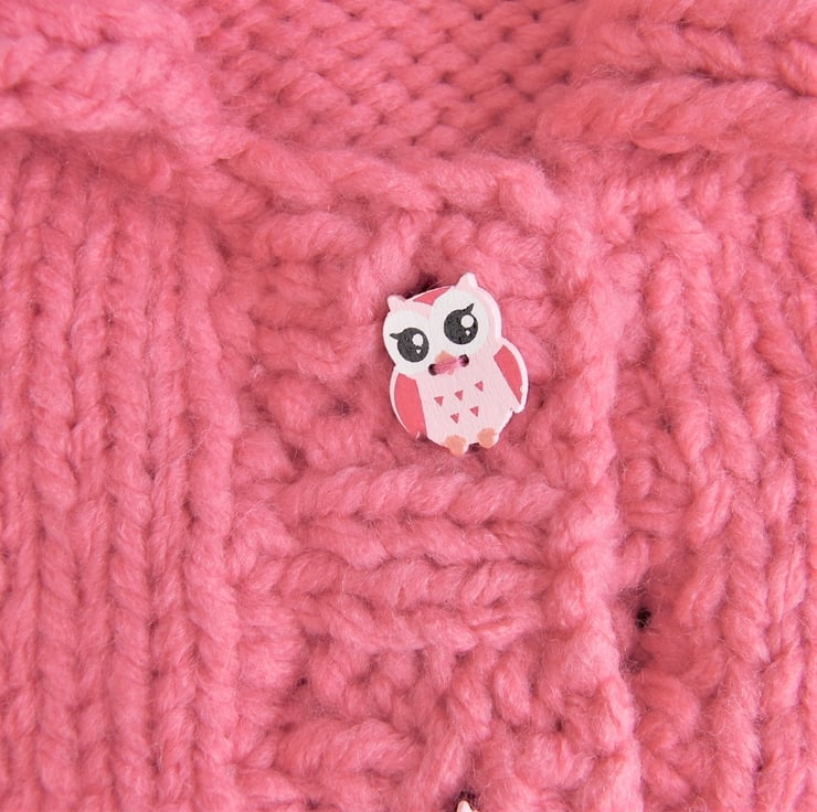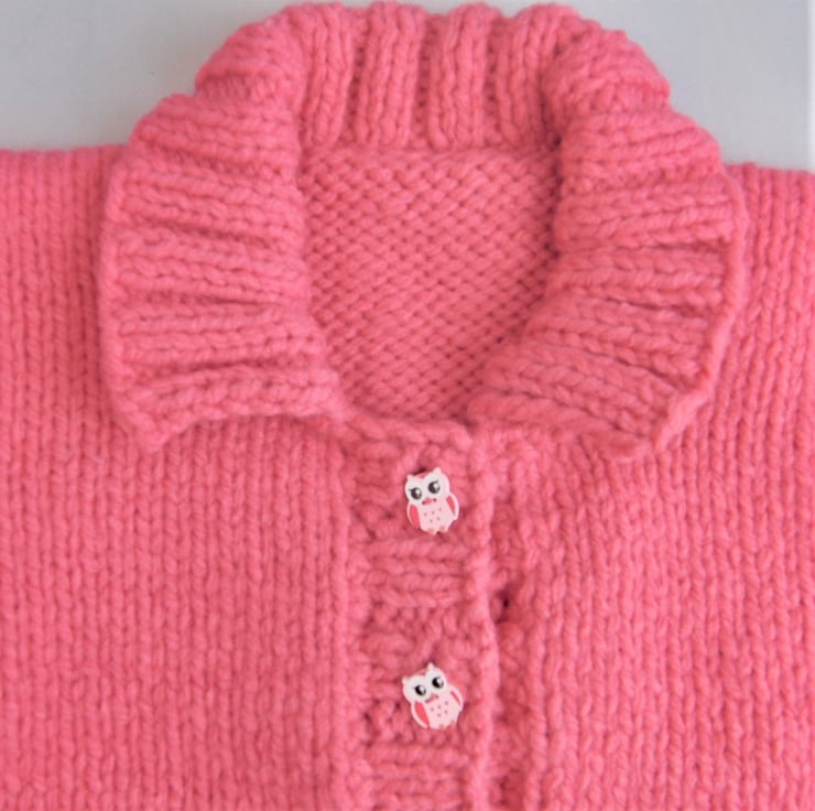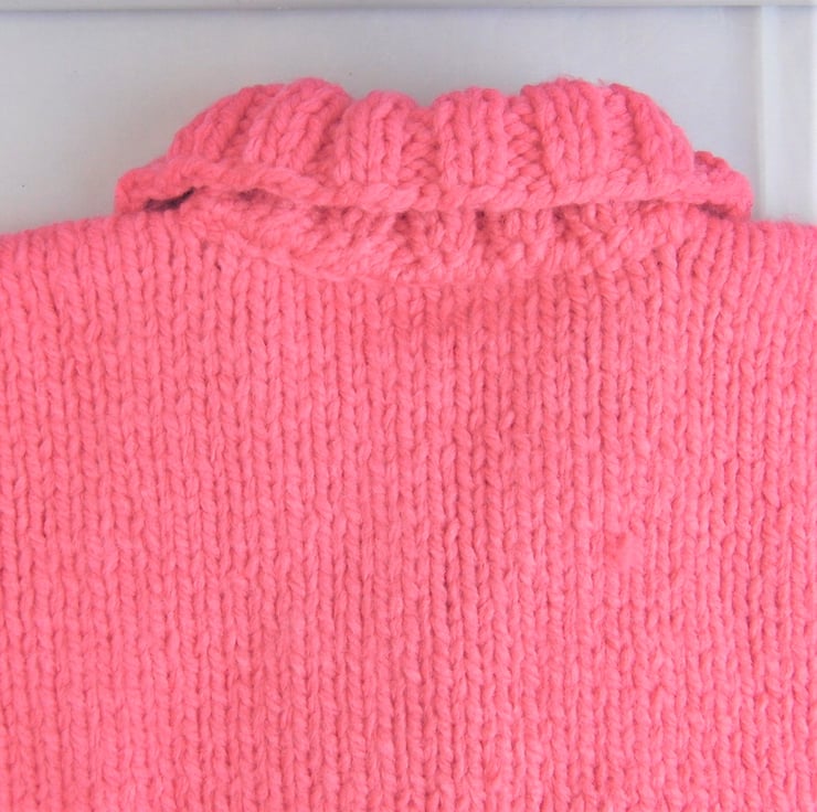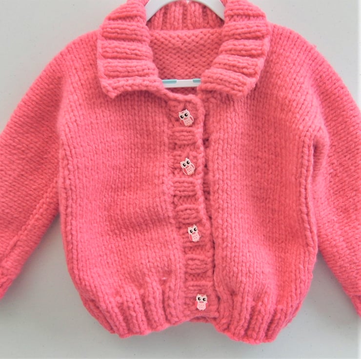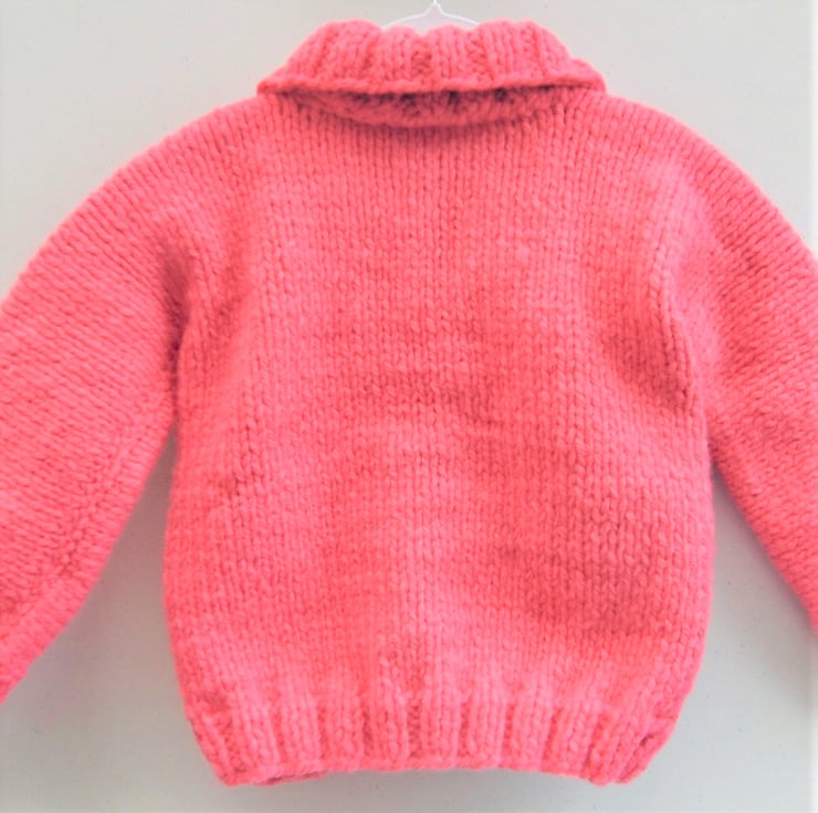 Warm and cosy girl’s cardigan with a collar, hand knitted with super chunky yarn to give that extra thickness and warmth.