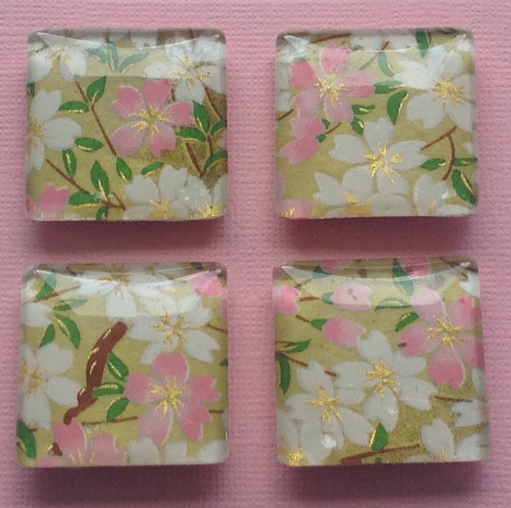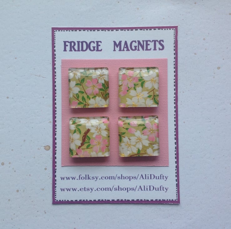 I have created this set of 4 fridge magnets using gorgeous screen- printed , Japanese yuzen/ chiyogami paper .They have a clear , domed, glass cabochon over them which slightly magnifies the images underneath . There is a strong, thin , neodymium magnet on the reverse side .