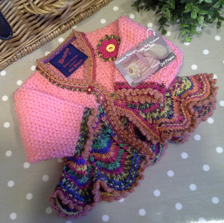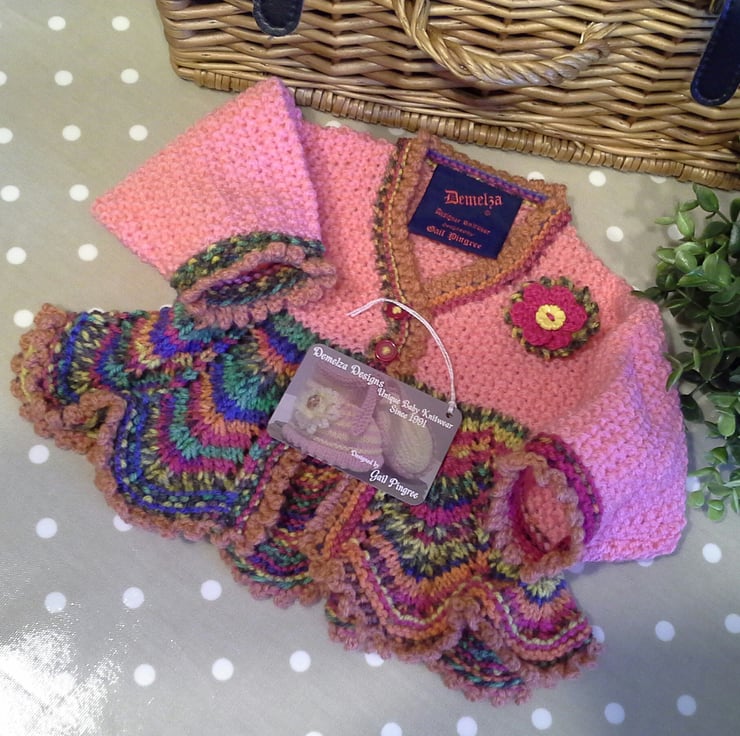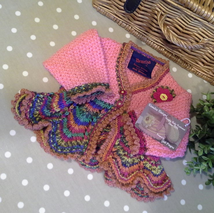 A very unique eye catching baby girl's scalloped lace effect cardigan designed and lovingly hand knitted using branded British yarns. All yarns used are machine washable at low temperatures. Around the garment edges is a delicate cratocheted edge adding a distinctive finish. On the front is a decorative crotcheted flower with a yellow flower button in the centre.