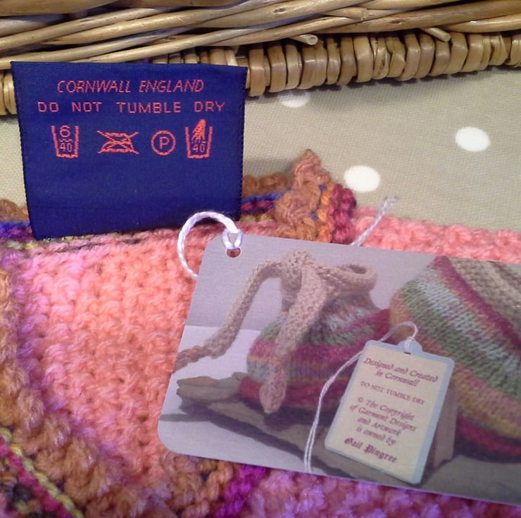 Baby knitwear is designed and hand crafted by Demelza Designs in Cornwall meeting UK baby safety standards, Only branded premuim acylic, acrylic/natural fibre blends or pure natural fibre yarns are used in baby knitwear which conforms to BS984/76 standards.