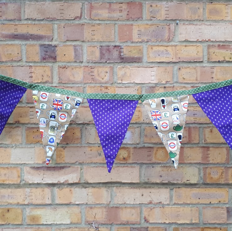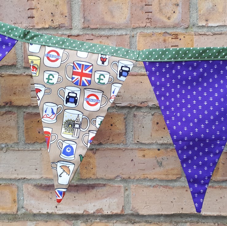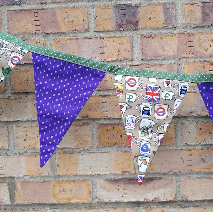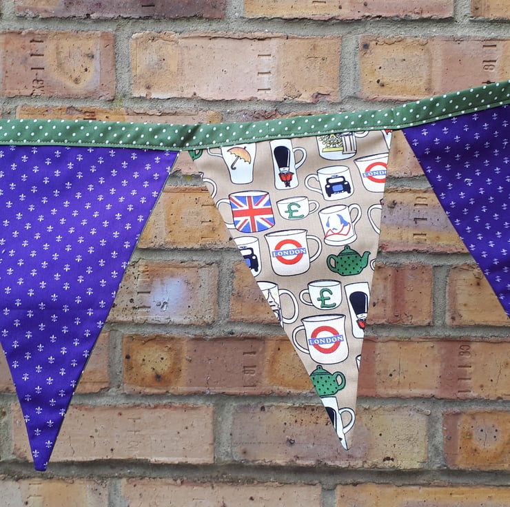 Bunting made using a beige London theme fabric. The print includes tea cups, queens quards, umbrellas, phone boxes, big Ben, London eye and the flags.