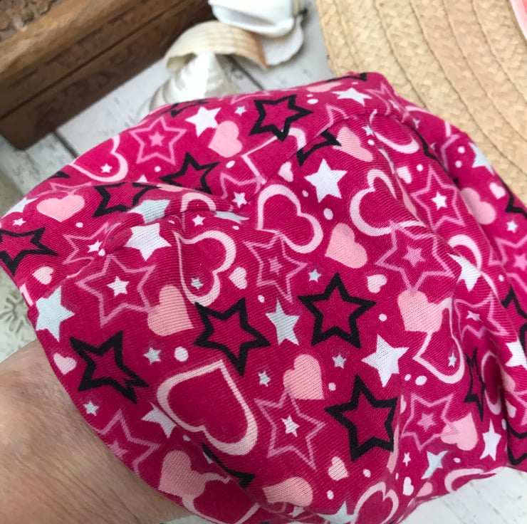 A lovely colourful dog snood suitable for a medium neck. Double sided and can be rolled down. Made with polyester t shirt fabric. Nice a easy to pop over the head.Useful for protecting long ears from the feeding bowl.