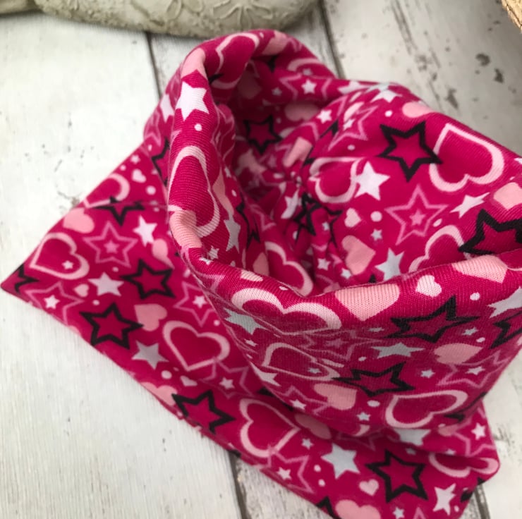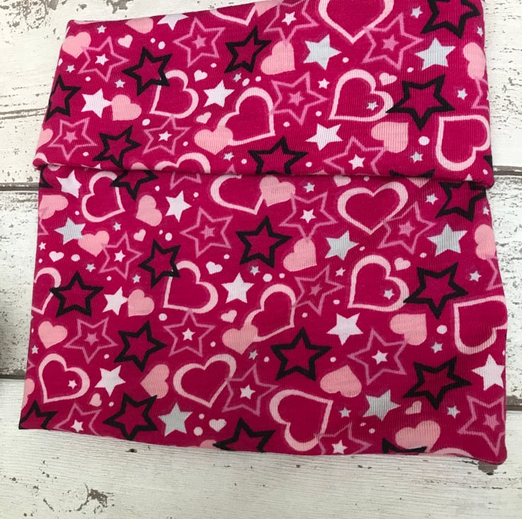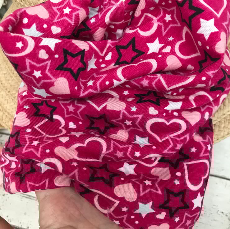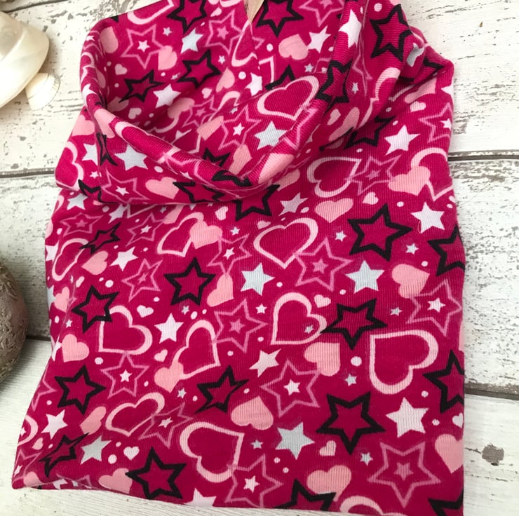 A lovely colourful dog snood suitable for a medium neck. Double sided and can be rolled down. Made with polyester t shirt fabric. Nice a easy to pop over the head.Useful for protecting long ears from the feeding bowl.