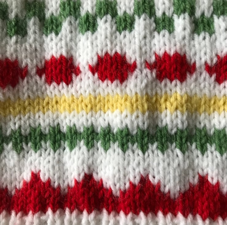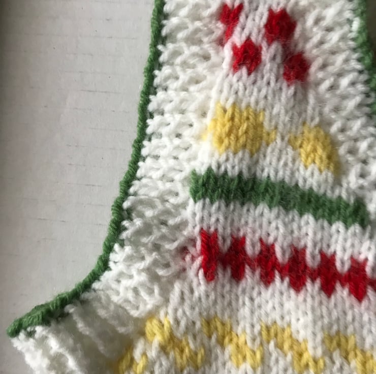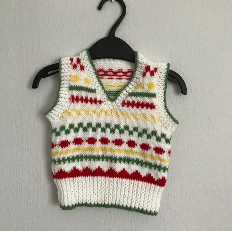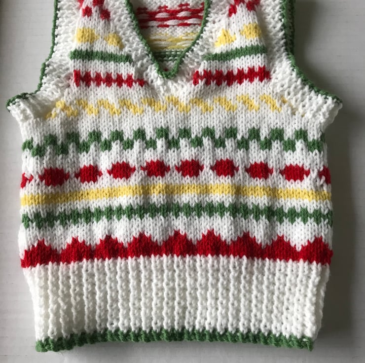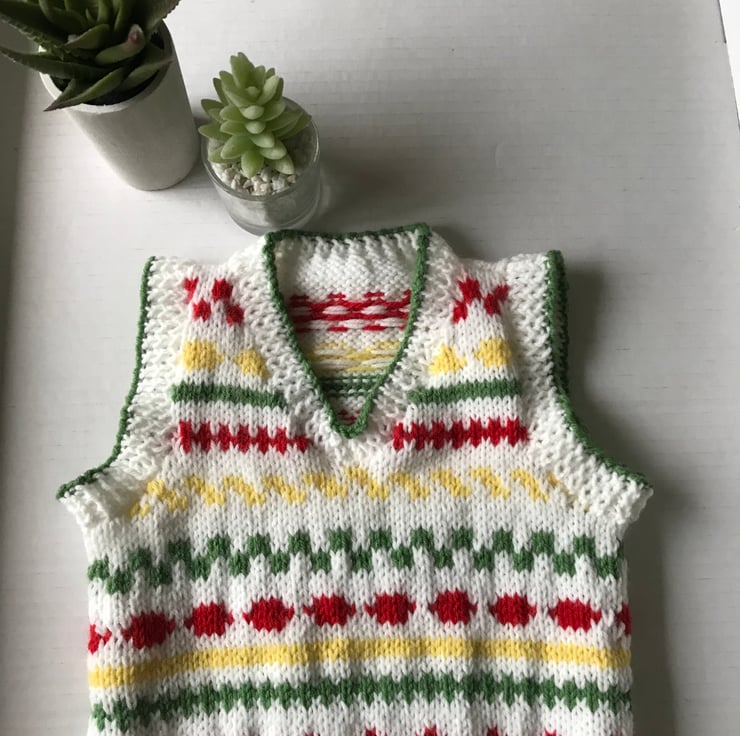 This brightly patterned tank top is hand knitted in a soft acrylic yarn. The background is a soft cream with a red, yellow and green fair isle pattern and is edged in green. It has a deep twisted rib and a v-neck.