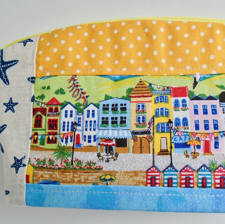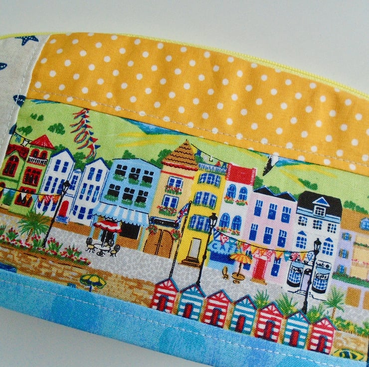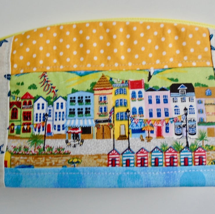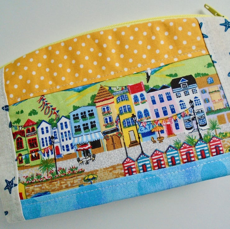 Made in various lovely cotton prints , and a pale yellow zip across the top as closure .