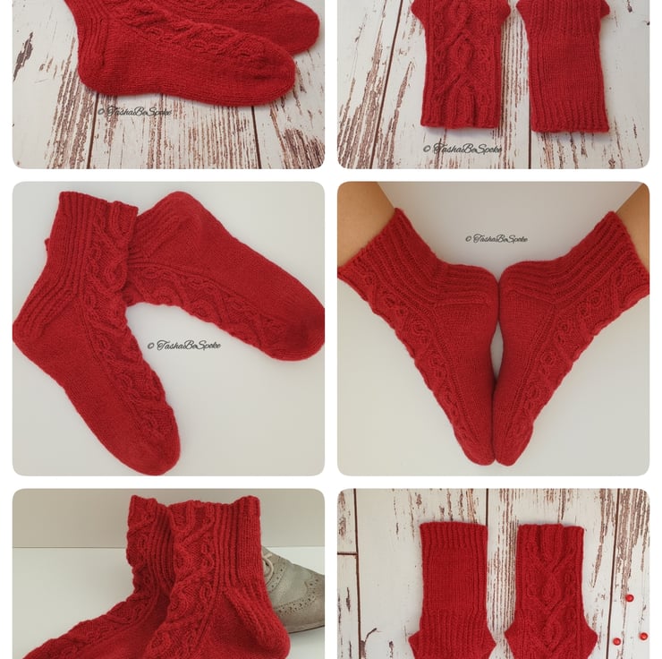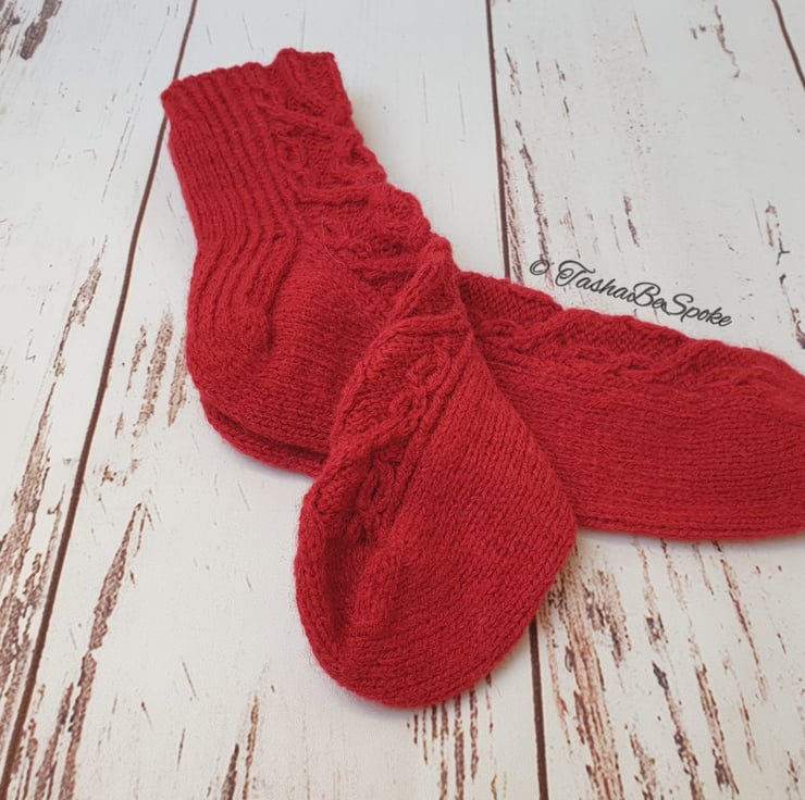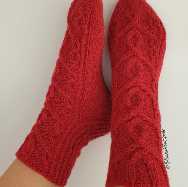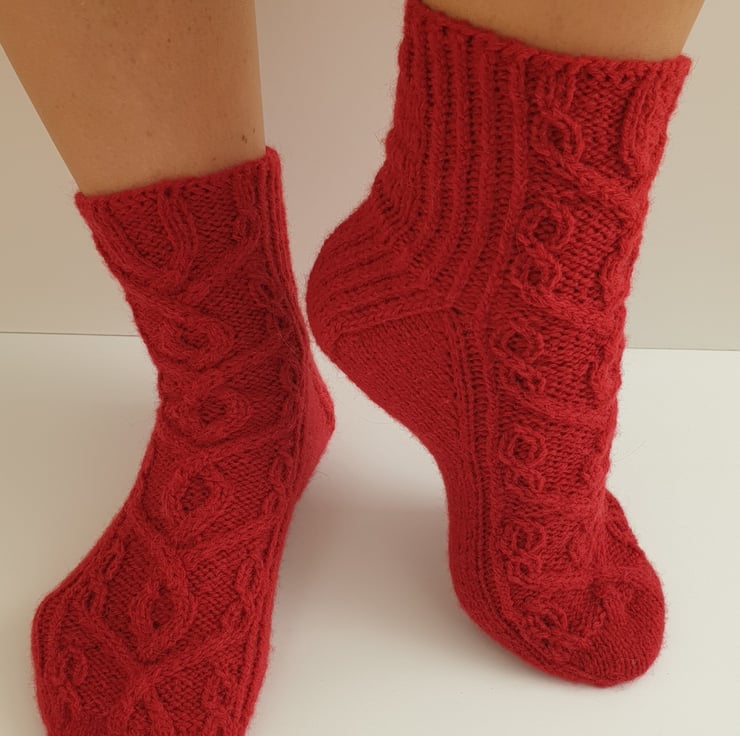 Hand knitted women socks with beautiful cable pattern running in front of the socks from the toes to the ankle in currant red colour.