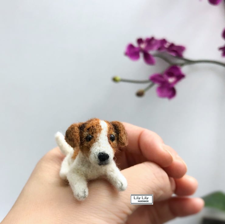 A cute miniature puppy dog needle felted by Lily Lily Handmade. A one of a kind collectable, perfect as a ornament or lucky mascot. The Jack Russell puppy dog, called Timmy is a cheeky little dog who is looking for his forever home.