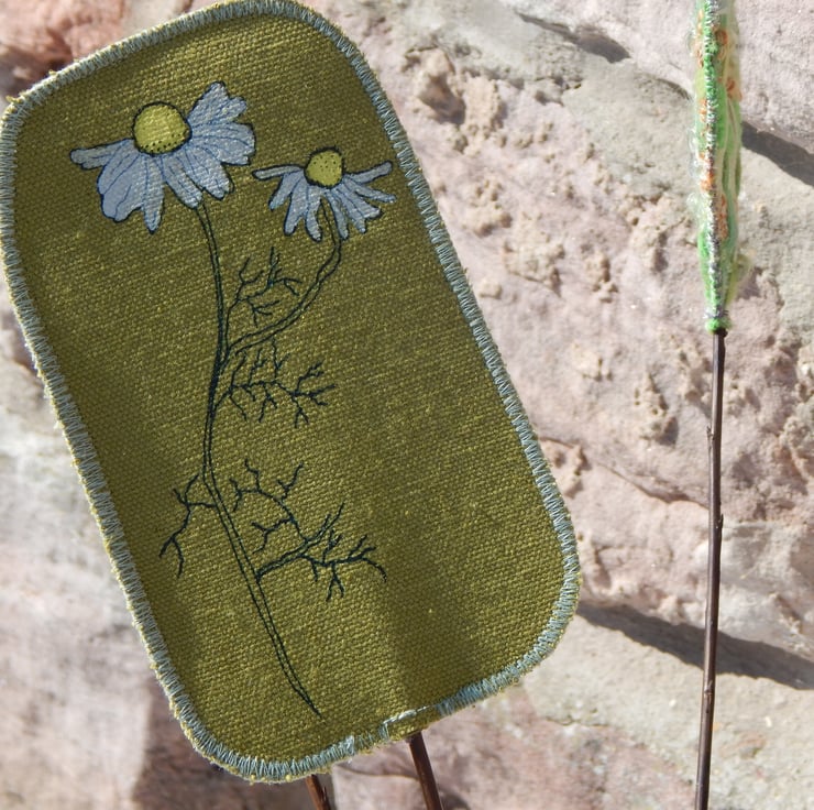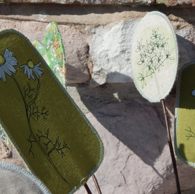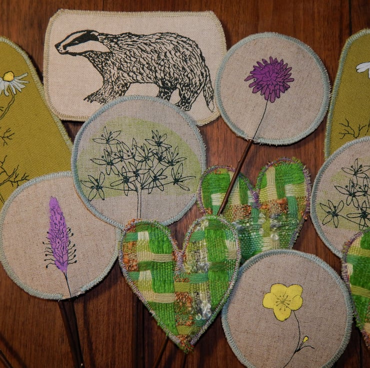 I have 1 badger, 1 plantain, 1 scabious, 2 wild garlic, 1 buttercup, 2 daisies and 4 green hearts. The pink flowers are screen printed in black and then the colour is handpainted, this is the same for the buttercup. The wild garlic is screen printed in black and then a lino print of light green is added to make it come alive alittle. The daisies are also screen printed and then the centre and petals are hand painted to make them pop on the green canvas fabric.