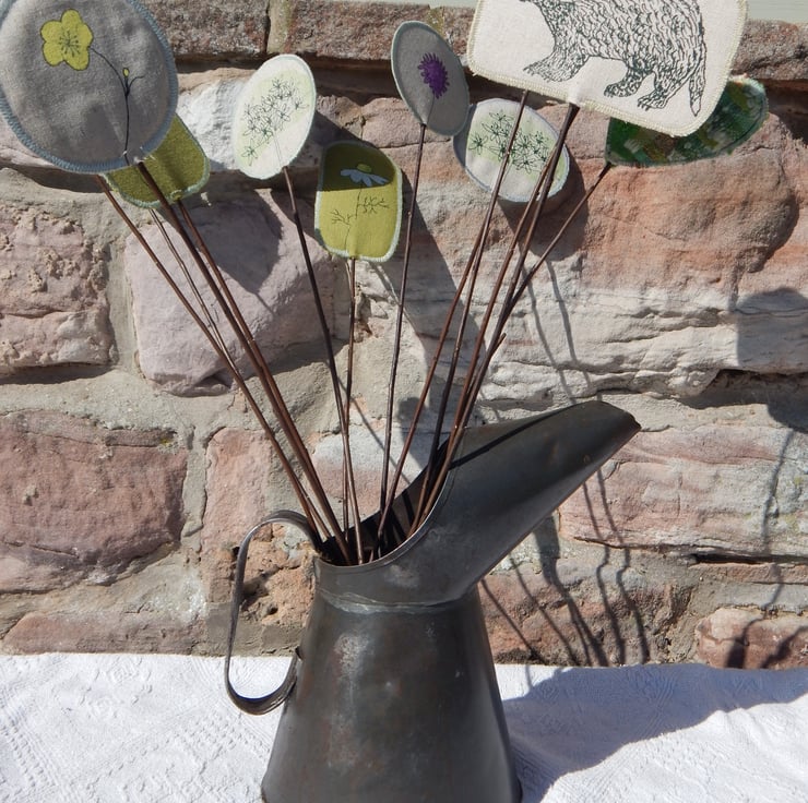 This is a bouquet of 12 fabric flowers on willow. Each are double sided with at least 2 layers of interfacing to give stability. They are sewn together and then zig zag stitched around the edge to neaten and prevent fraying. Designed for indoor use.