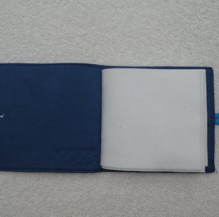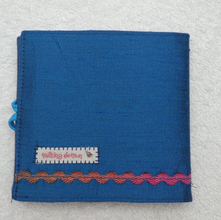I have created this useful sewing needle case from a lovely blue silk fabric. It has an applique decorative panel with a black cat, and is embellished with braid. The needle case is lined in a plain blue cotton fabric, has interfacing for structure and has 2 felt inserts to keep your needles safe. The case has a printed wooden button and elastic to close, and is top stitched for a professional finish.