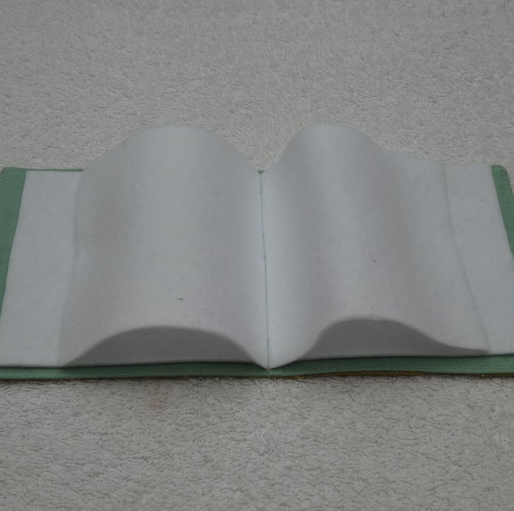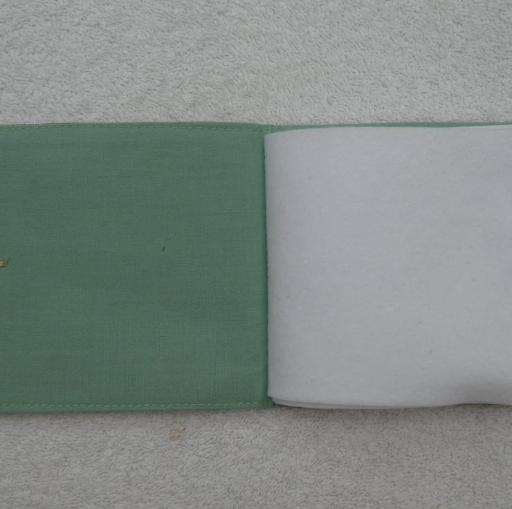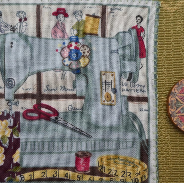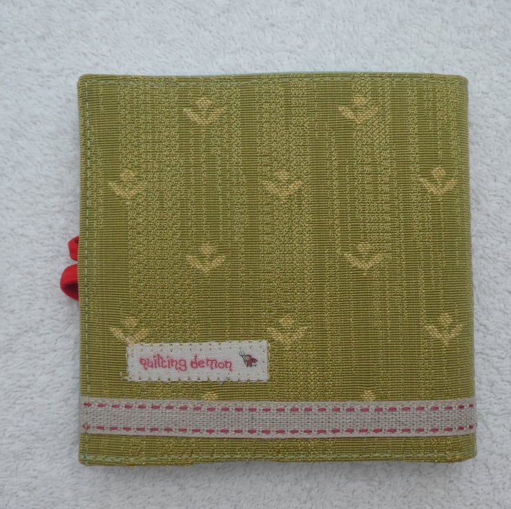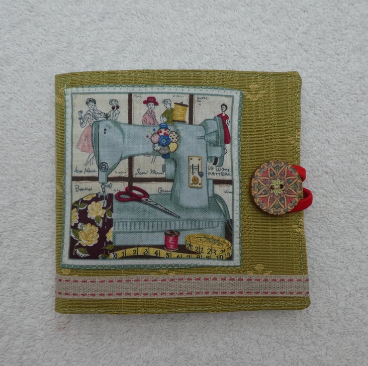 I have created this lovely sewing needle case from a lovely upholstery weight print cotton. It has an applique decorative panel and embellished with braid. The needle case is lined in a plain green cotton fabric, has interfacing for structure and has 2 felt inserts to keep your needles safe. The case has a printed wooden button and elastic to close, and is top stitched for a professional finish.