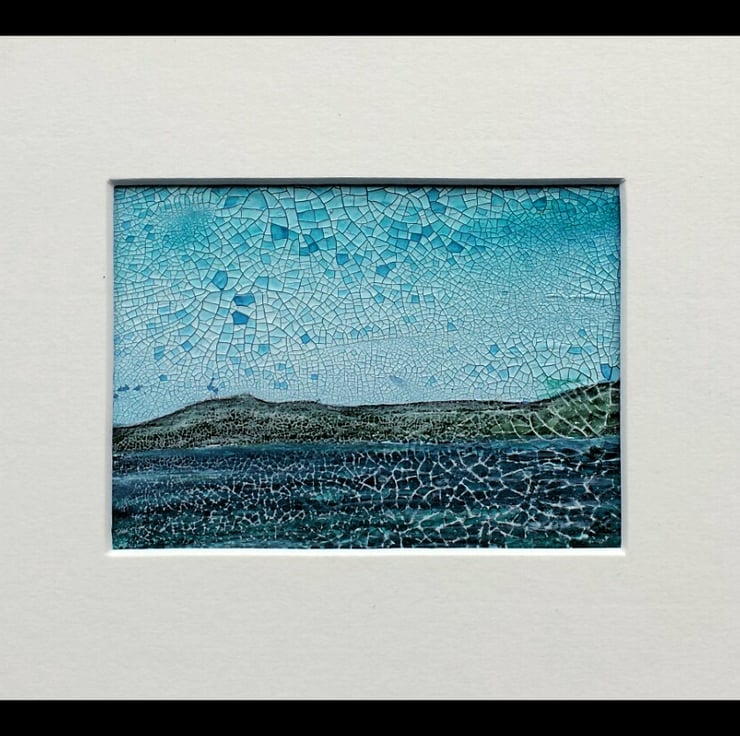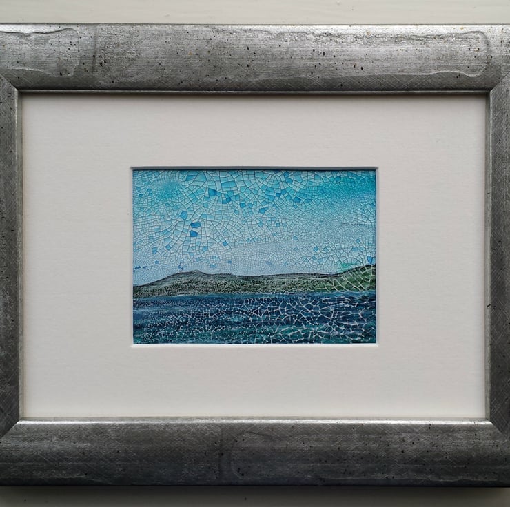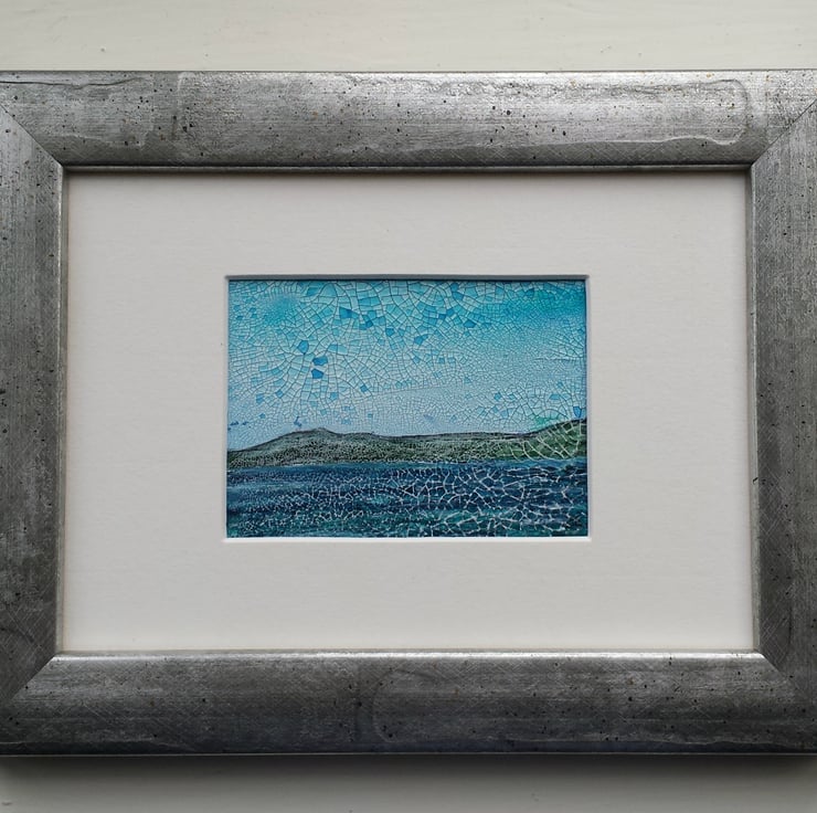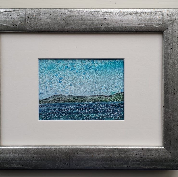 Seascape is an imaginative wee semi abstract painting. Textured and atmospheric, it was created using watercolours with a touch of inktense on the textured base.