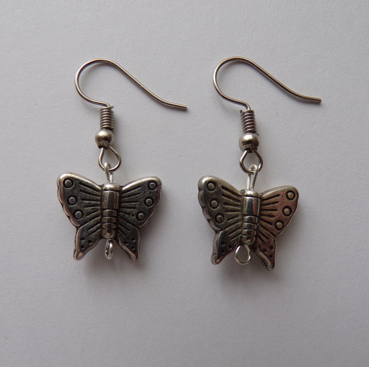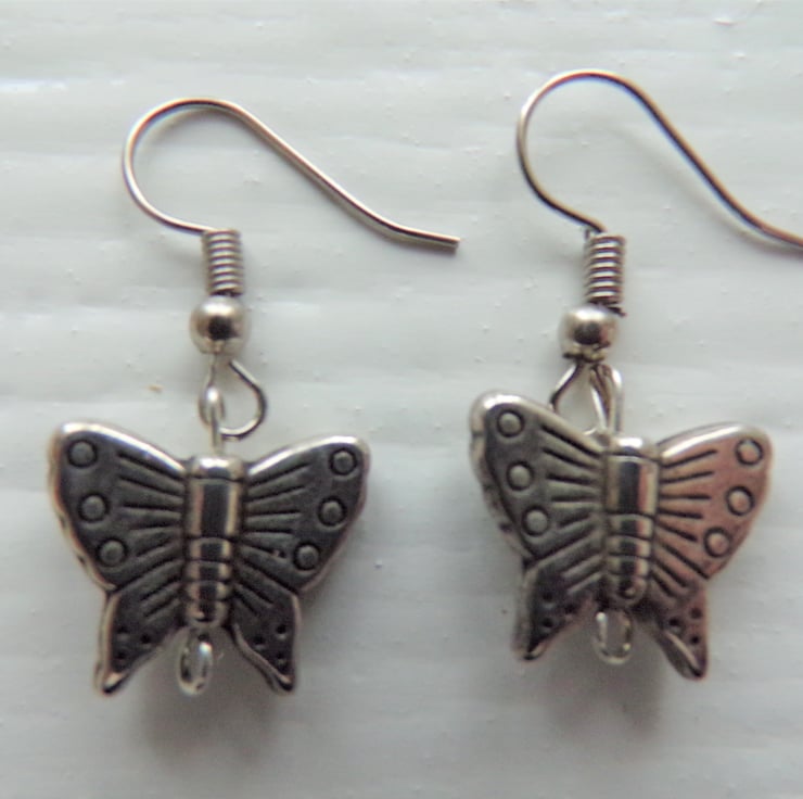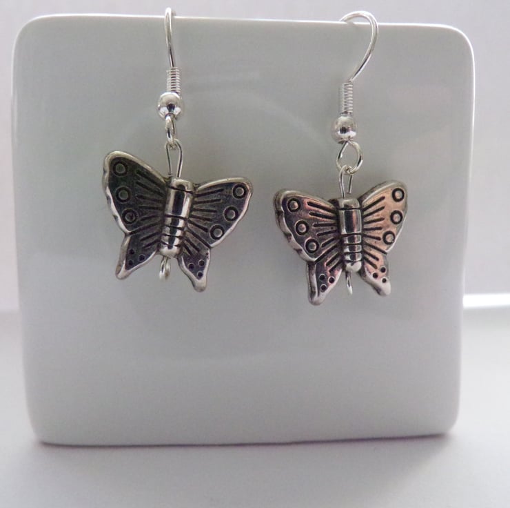 Pretty pair of silver coloured butterfly earrings. They measure approx 1.5cm drop from the ear-hook, they are on a nickle free, silver plated ear-wire (perfect for sensitive ears).