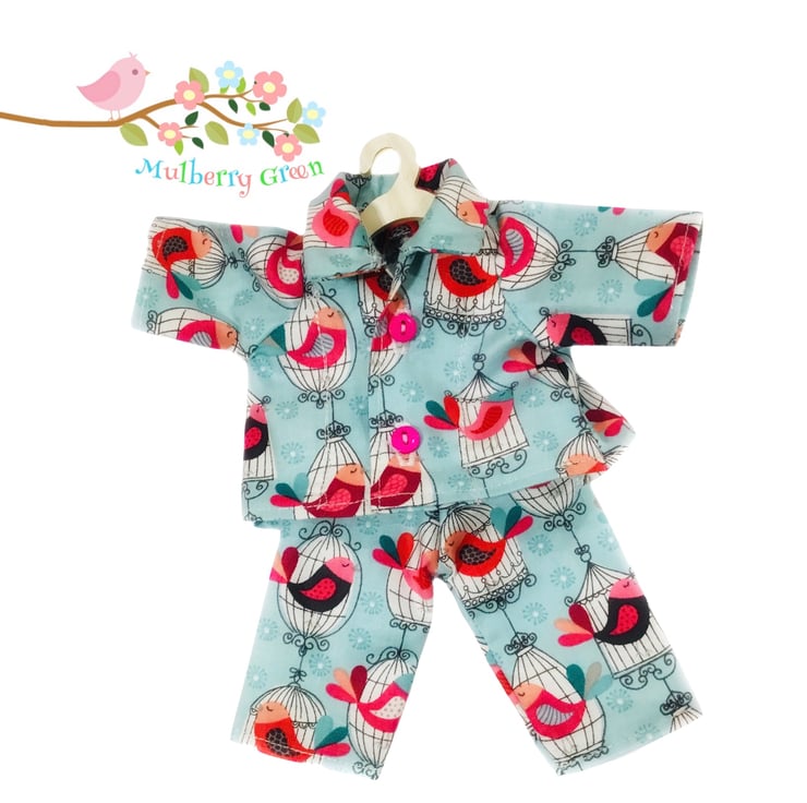 A totally cute little pair of pyjamas to fit the Mulberry Green characters. The pyjamas are made from best quality cotton and are tailored like real pyjamas. They fasten with two little bright pink button and come with a cute little wooden hanger.