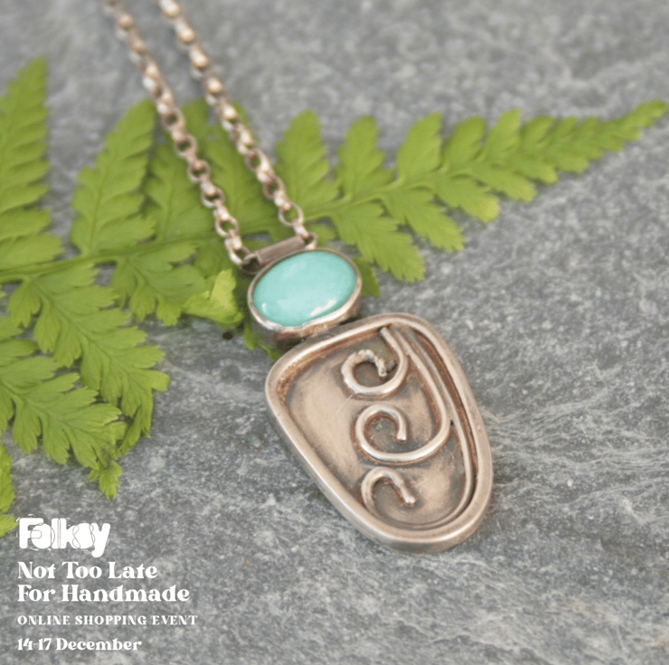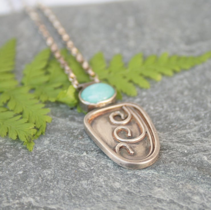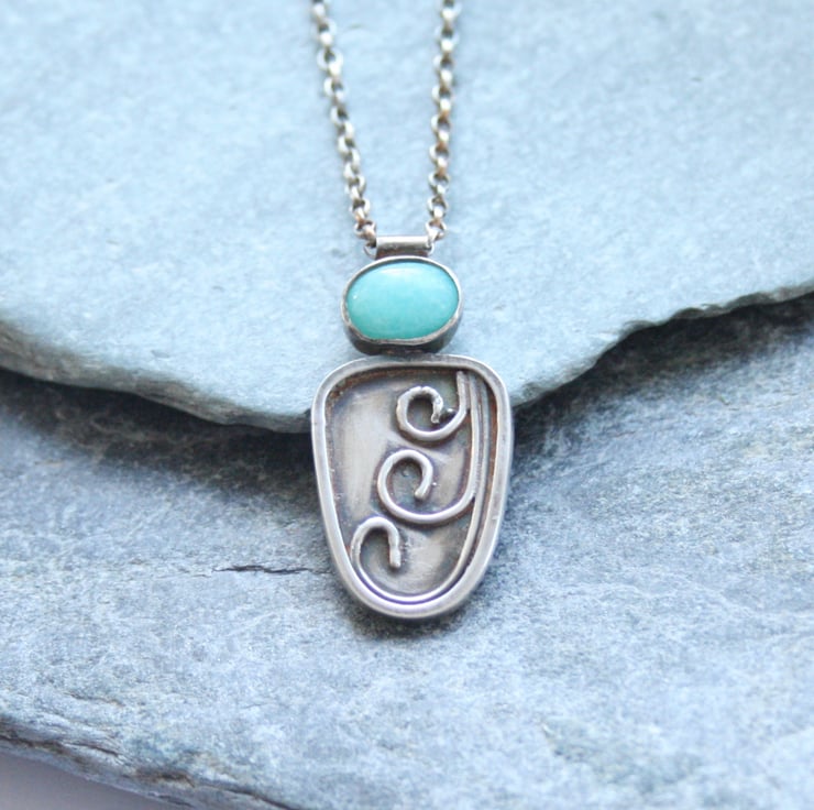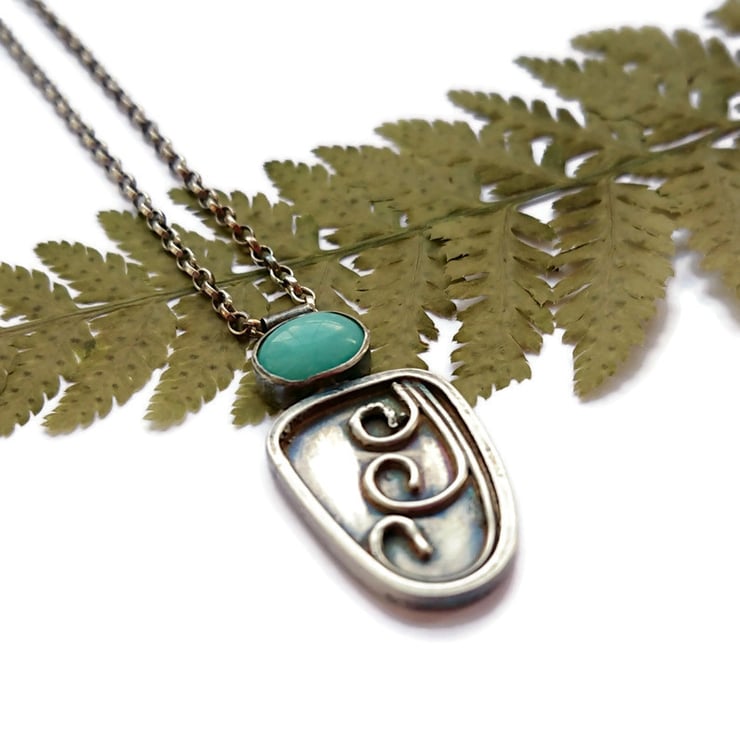 The necklace was created from sterling silver and I have set an amazonite gemstone at the top. The gemstone amazonite is believed to have a soothing and calming influence on the brain and nervous system which I feel perfectly compliments the soothing effects of nature.