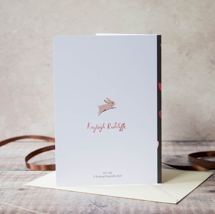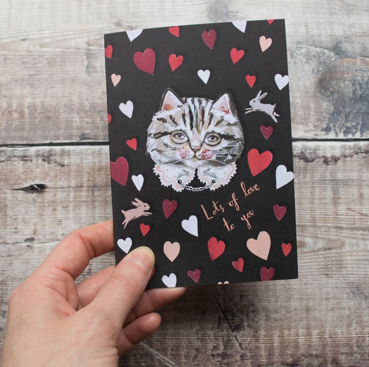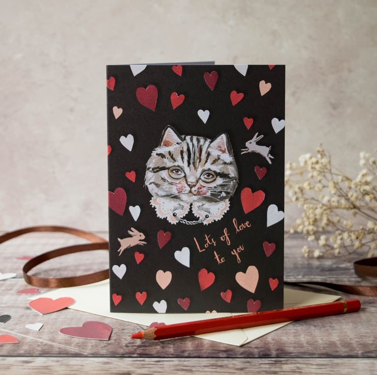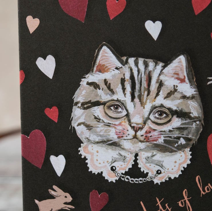 Featuring a tabby cat with love hearts and leaping bunnies.