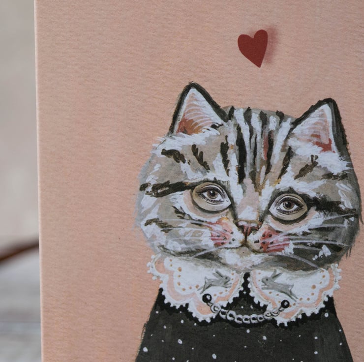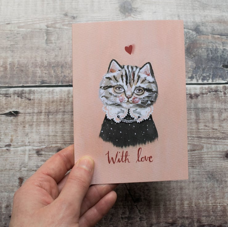 An adorable card featuring a tabby cat with a love heart. Perfect for those sweet centred souls out there!