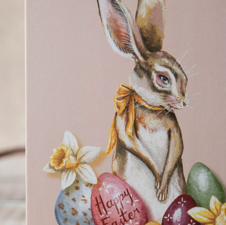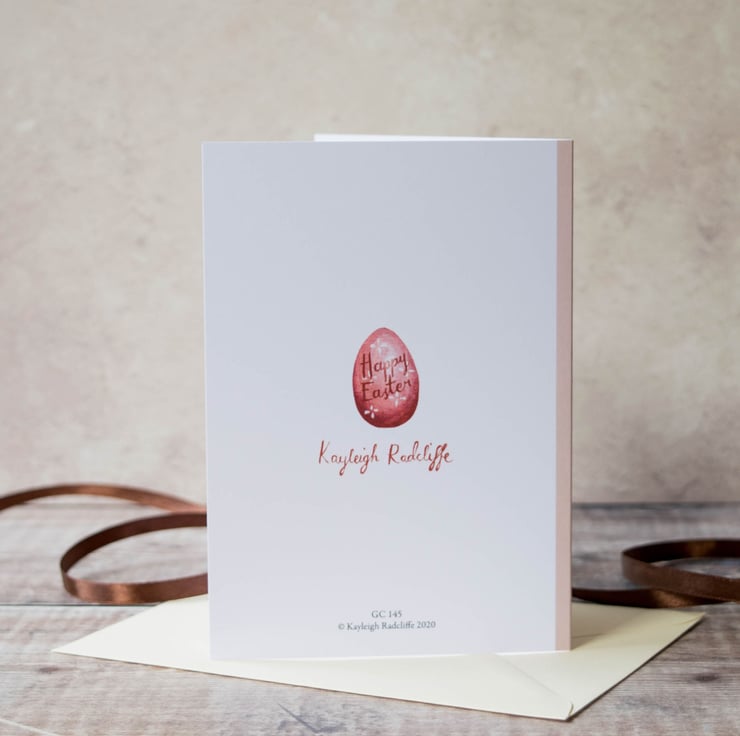 Blank inside so that you can personalise your own message. The front of the card, hidden upon an Easter egg, reads- "Happy Easter."