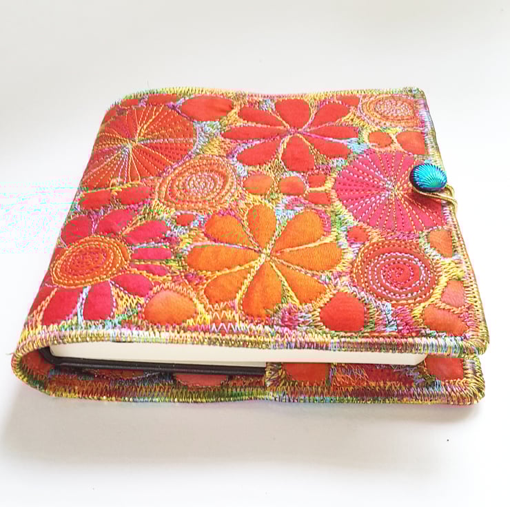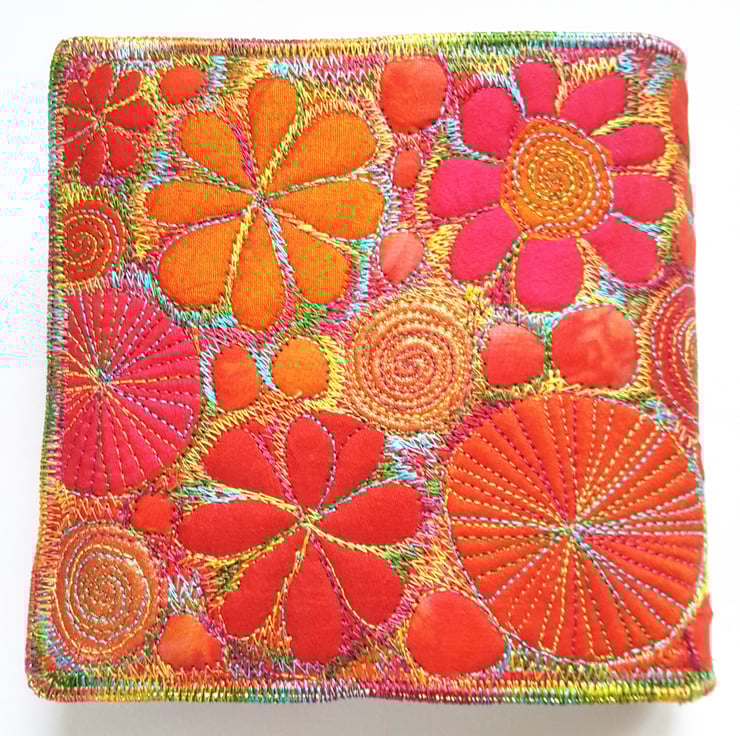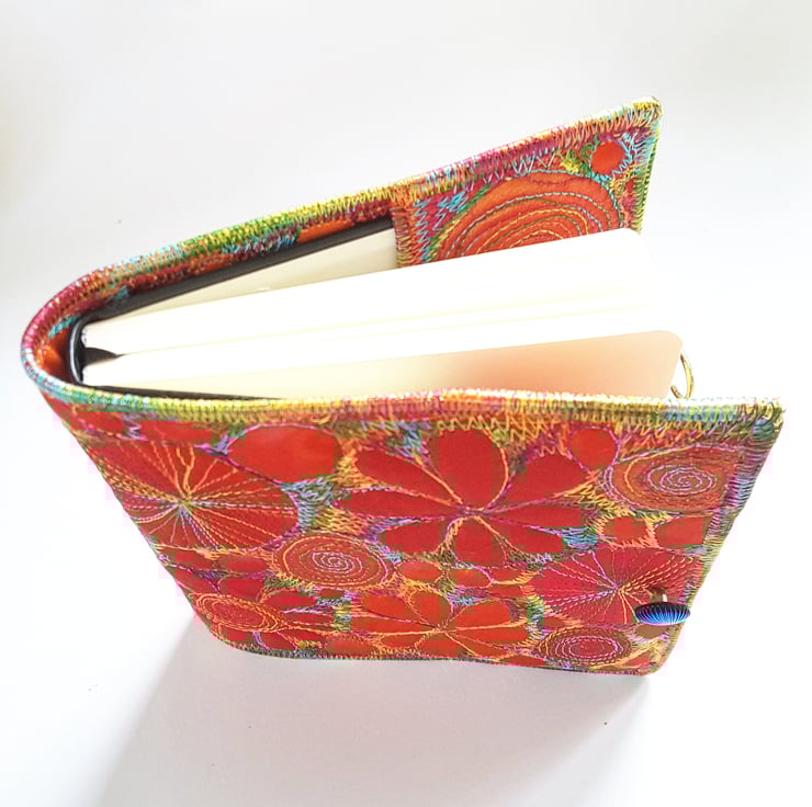 This is a handmade machine stitched fabric textile notebook cover and cream plain paper artists sketchbook 12cms x 12cms. 80 sheets 140gsm acid free. The cover is removeable and you can replace the sketchbook inside.