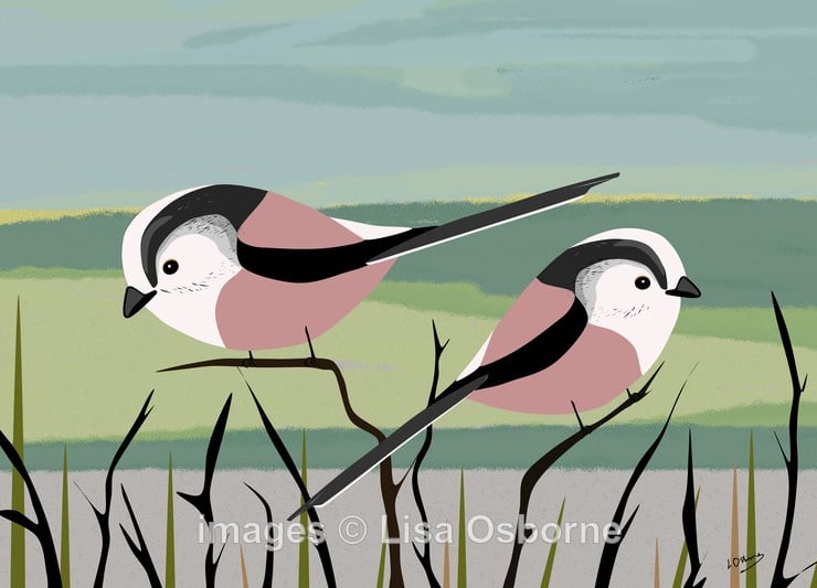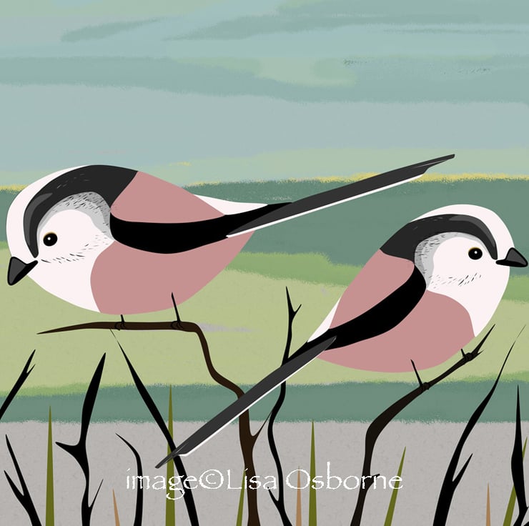 Long-tailed tits - colourful print of these delightful little garden birds.