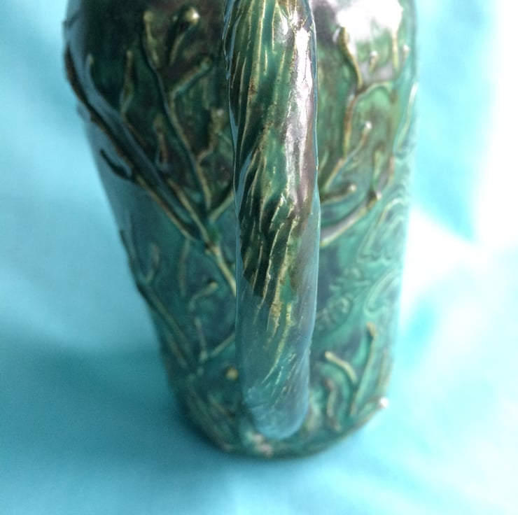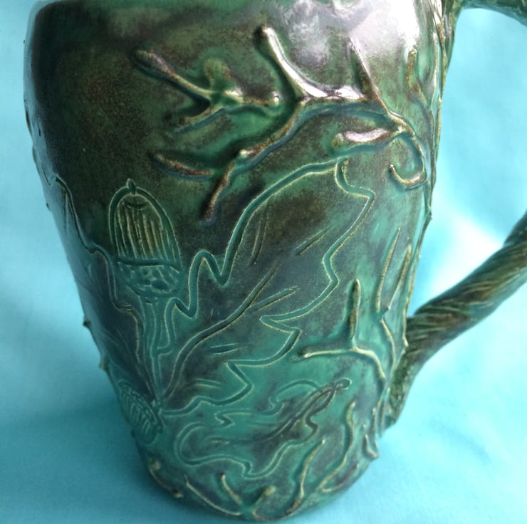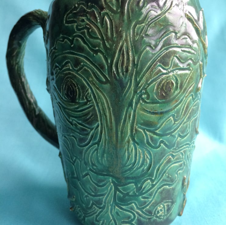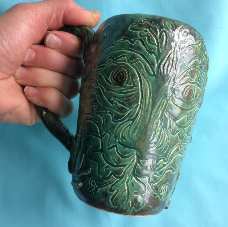 Hand built ceramic mug, chunky & robust for serious beverage use! The Green man face was scribed into the clay before firing & the branches added with slip making this a total one off.