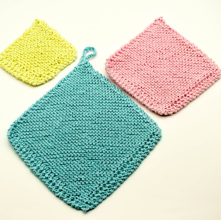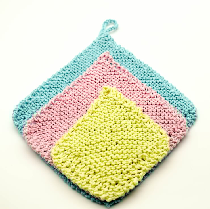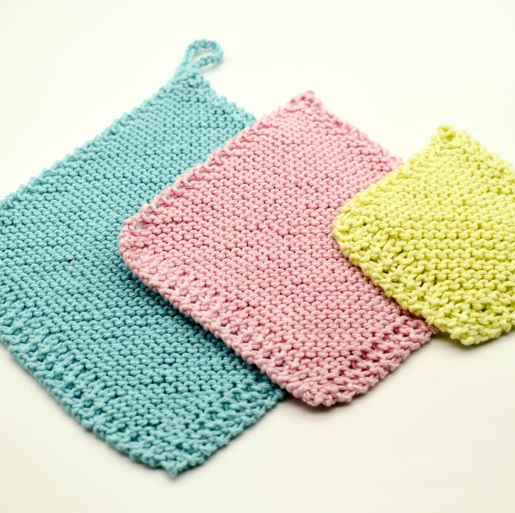 Hand knitted cotton wash cloths are great for all sorts of tasks. Much better to ditch the wipes and switch to these reusable cloths for washing your face and body. This pack of three cloths are each different sizes, with the larger size having a handy hanging loop;