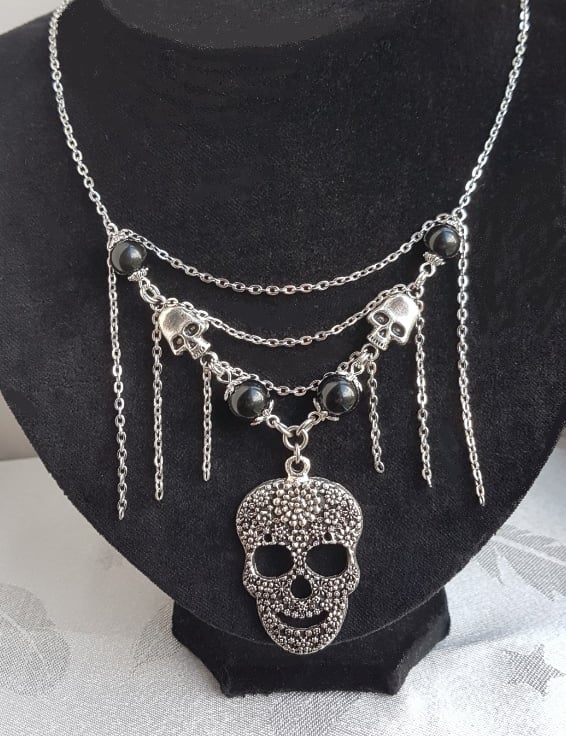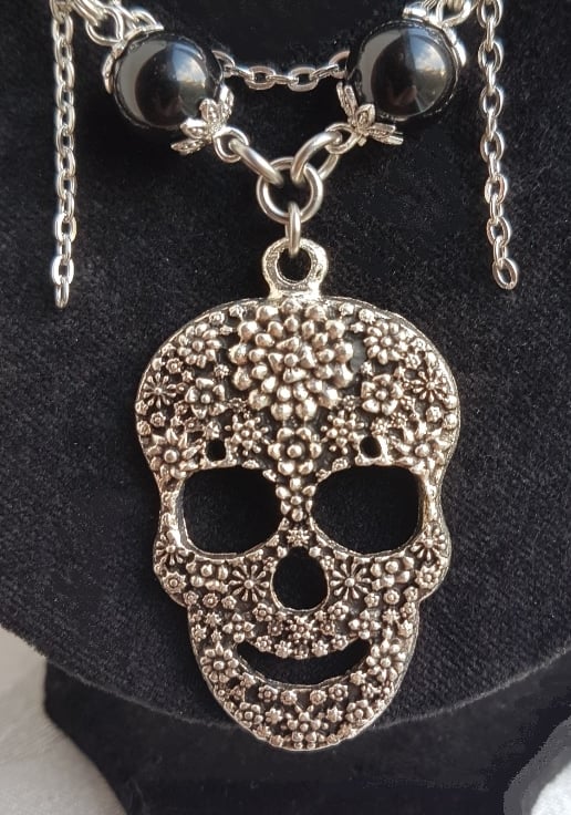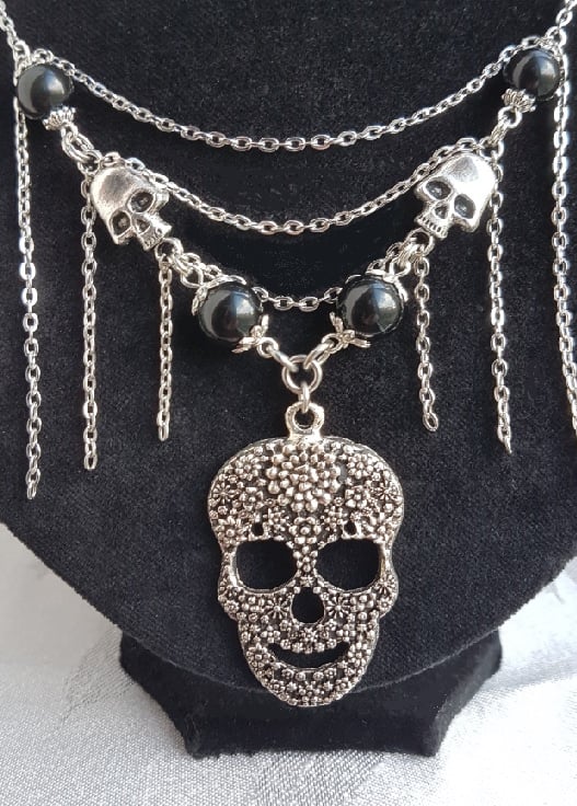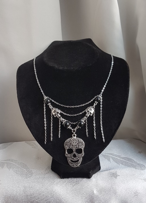 Lovely silver tones, Black Obsidian beads and Skull charms. This necklace is darkly beautiful and a must for those who love their jewellery a little on the darkside.