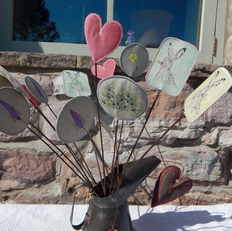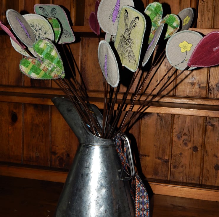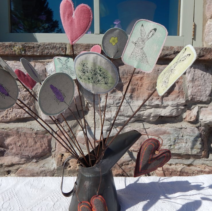 This is a bouquet of 16 fabric flowers on willow. Each are double sided with at least 2 layers of interfacing to give stability. They are sewn together and then zig zag stitched around the edge to neaten and prevent fraying. Designed for inside use.
