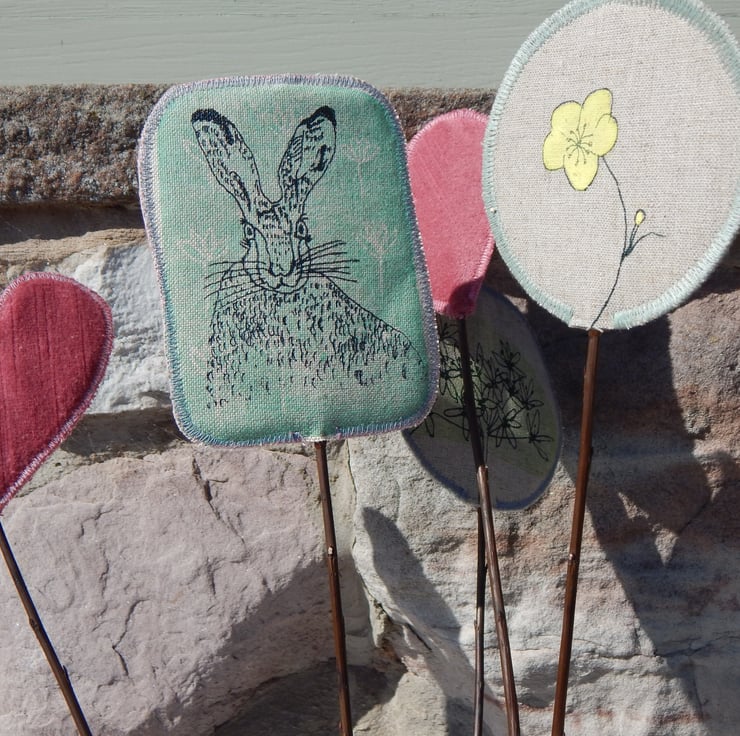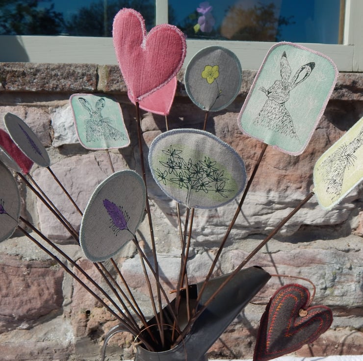 I have included 3 hares, 4 pink wild flowers, 2 buttercups, 1 wild garlic and a mix of green and pink velvet hearts. There is a mix of lino print backgrounds for the hares and wild garlic to give some green natural colour. The pink flowers and buttercups are screen printed then hand painted to give some pop of colour.