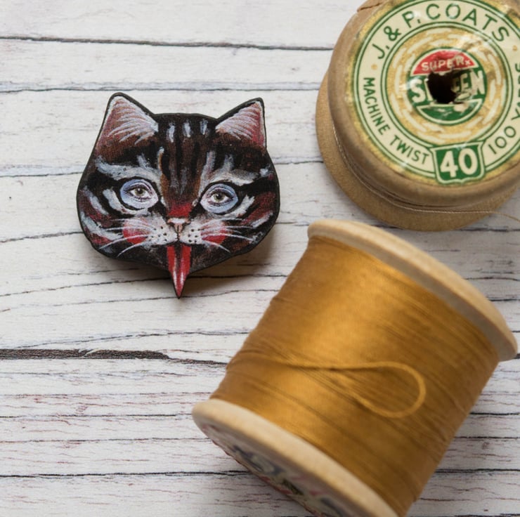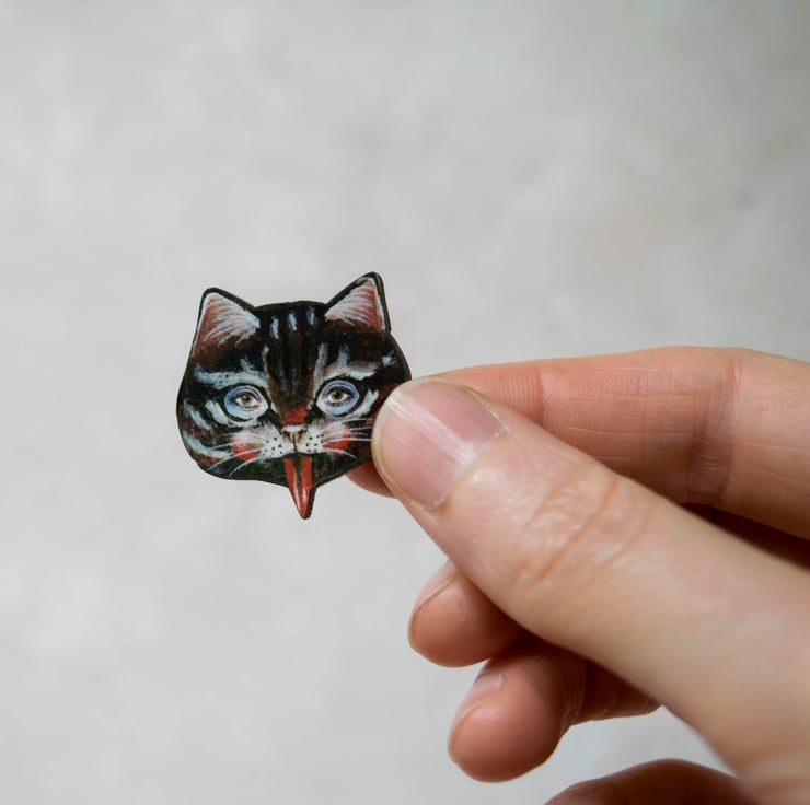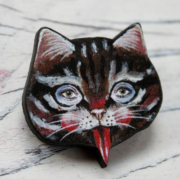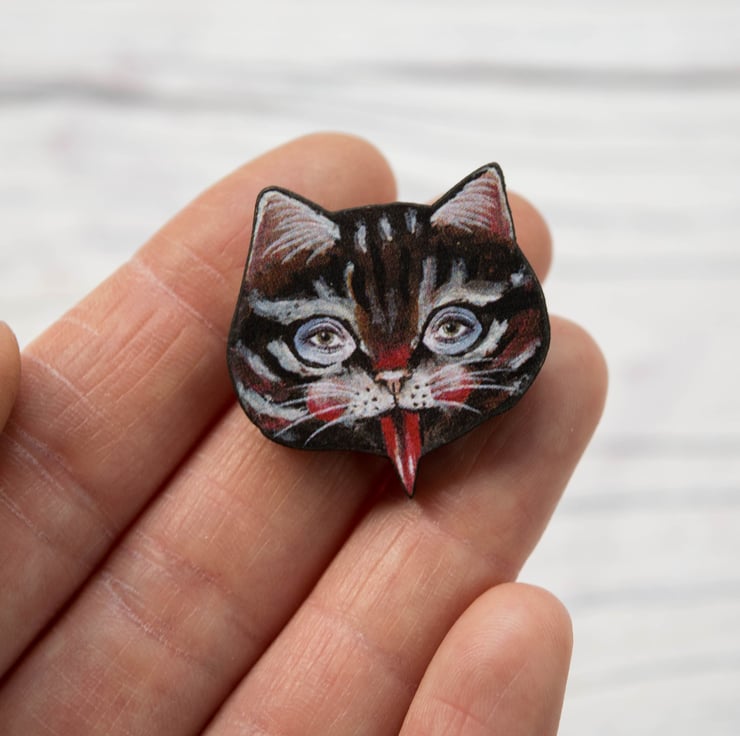 Krampus kitty now has a gloss coating to enhance his beauty and is plain wood on the reverse. A brooch bar pin is attached to the back of him so that you can pin him to wherever you like.