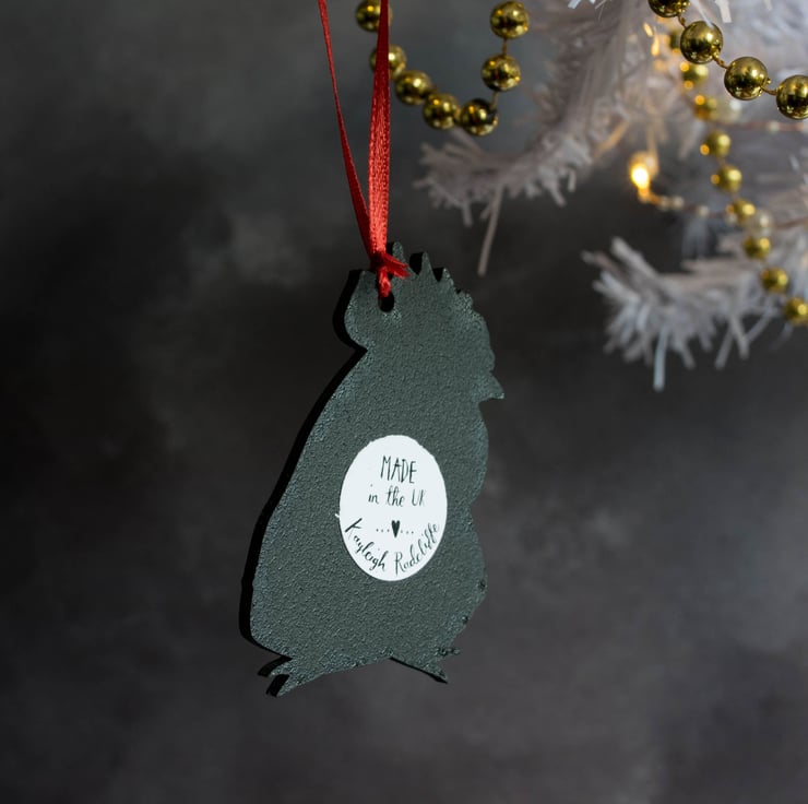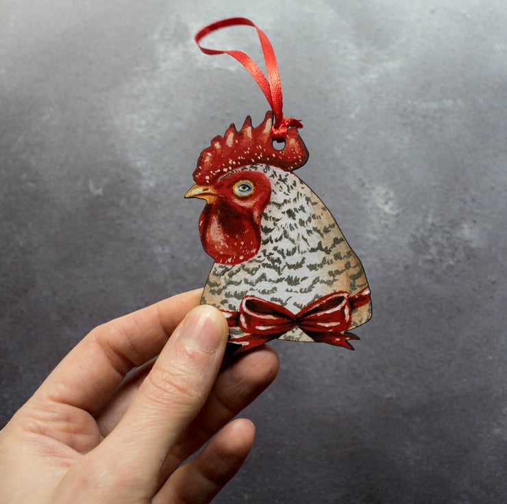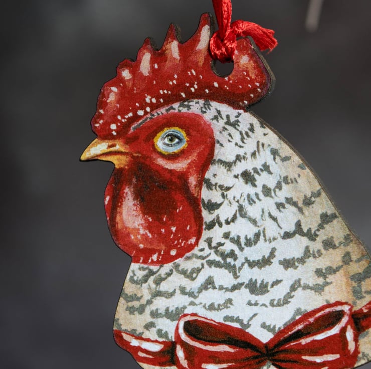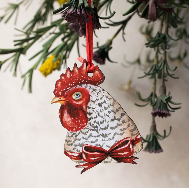 Designed and illustrated by myself, and printed and laser cut within the UK. The chicken features on one side of the decoration and is black on the reverse.