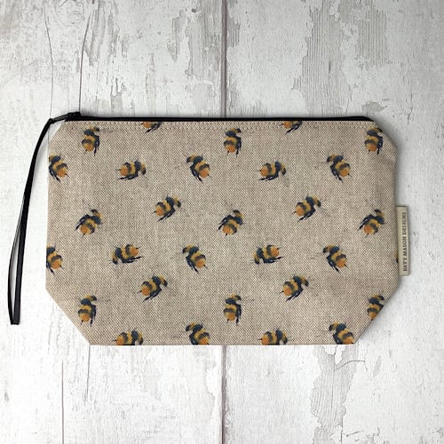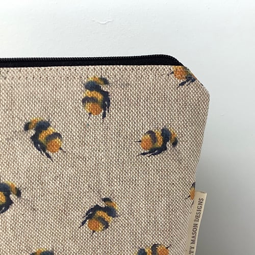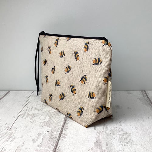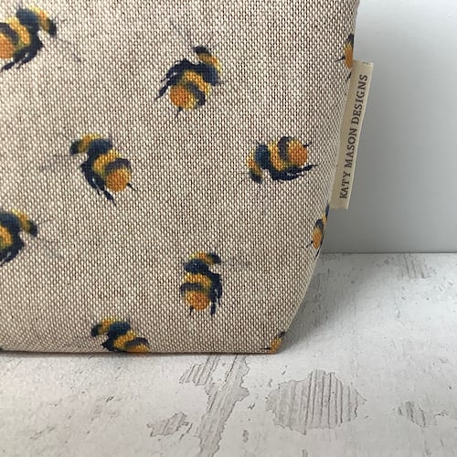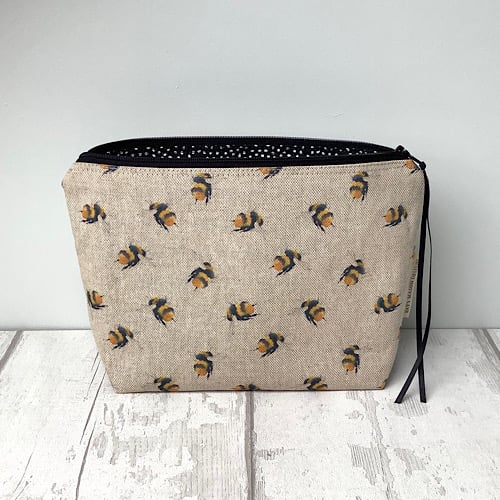 Cosmetic bag in a natural linen mix with a bee print. Fully lined in black spot with a yellow zip. 17.5cm wide at bottom, 24cm wide at top, 15.5cm high, 7cm deep at base. Please note, there might be a slight difference to the pictures shown due to the pattern repeat of the fabric.