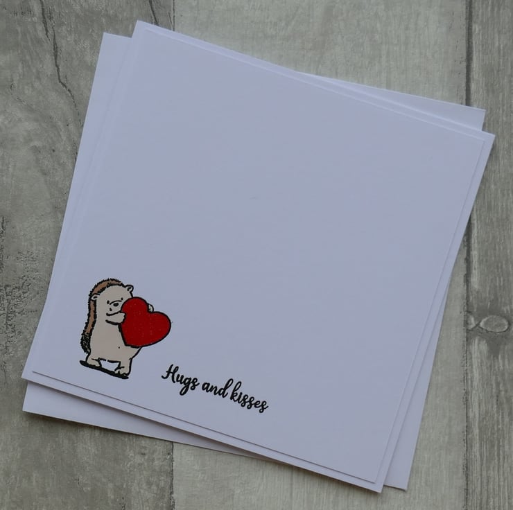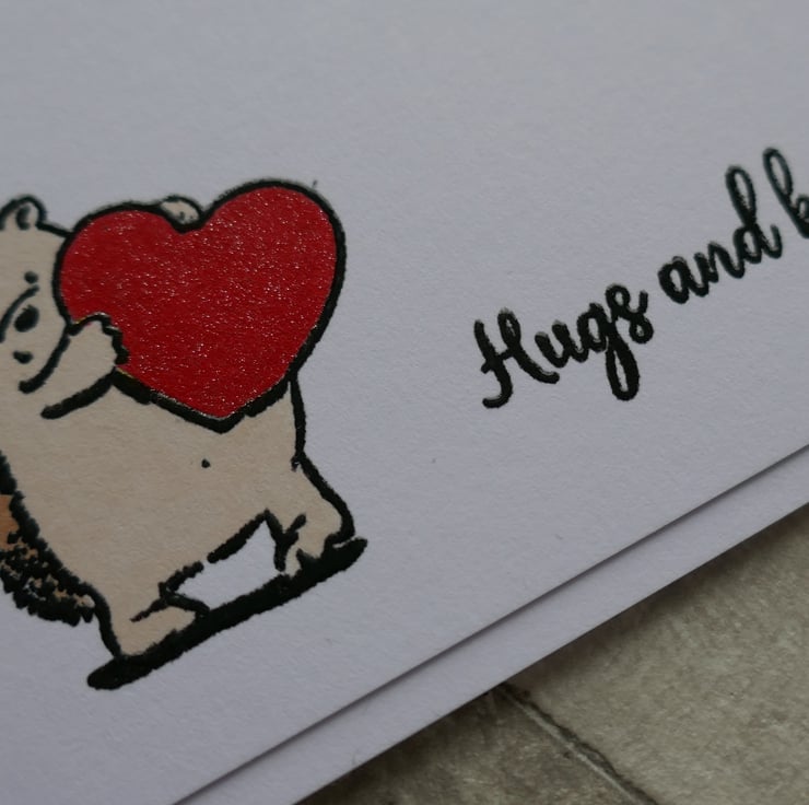 A small hedgehog holding a heart has been stamped onto a piece of card with the sentiment 'Hugs and kisses' stamped alongside. These have been embossed to give the outlines a lovely shine and then coloured with alcohol pens. The heart has also been highlighted with sparkle.