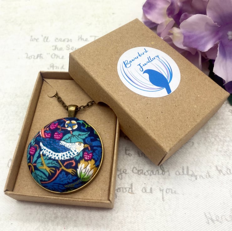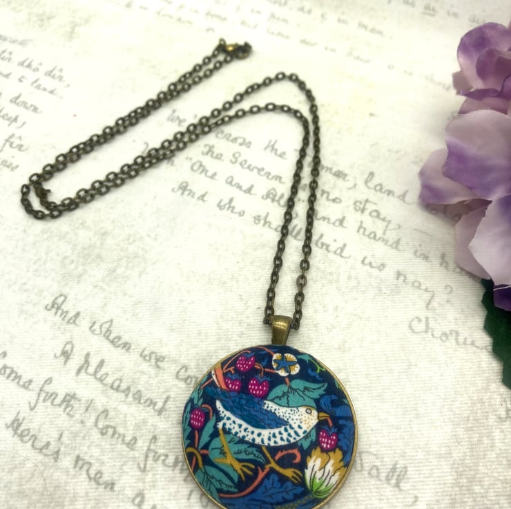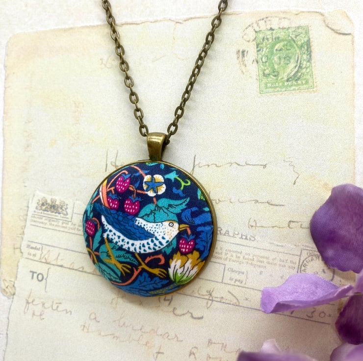 I have chosen a section of this fabric featuring a naughty Thrush stealing a strawberry. The blue tinted thrush stands on a dark blue background, surrounded by foliage and flowers in blues and greens with deep pink strawberries. I created a 38mm diameter fabric covered flat backed button. I then glued it into an antique bronze plated (nickel & lead free) round pendant blank.