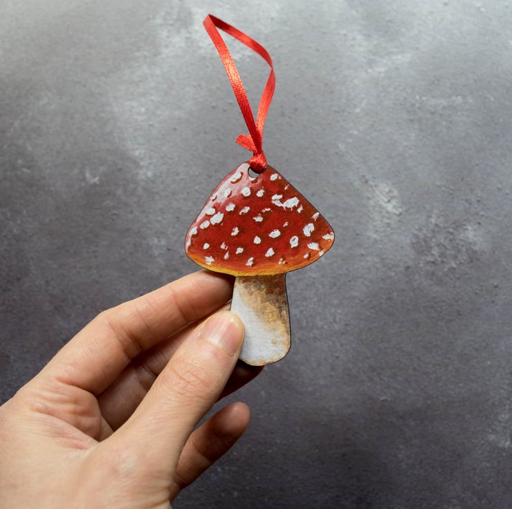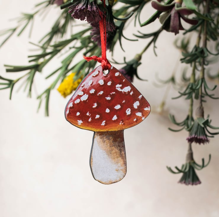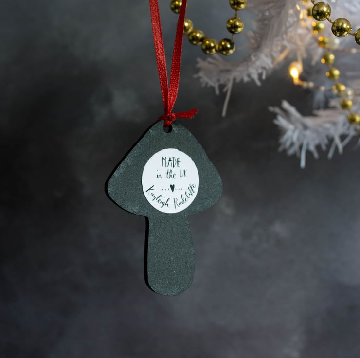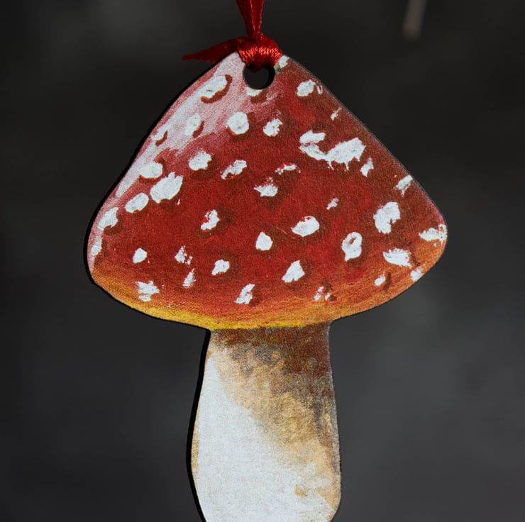 Designed and illustrated by myself, and printed and laser cut within the UK. The mushroom illustration features on one side of the decoration and is black on the reverse.